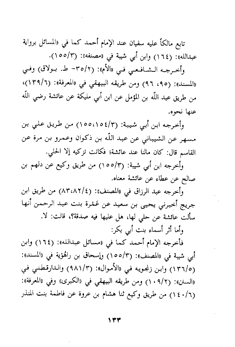 وأخرجه ابن أبي شيبة: (3/154، 155) من طريق علي بن مسهر عن الشيباني عن عبد الله بن ذكوان وعمرو بن مرة عن القاسم قال: كان مالنا عند عائشة؛ فكانت تزكيه إلا الحلي.