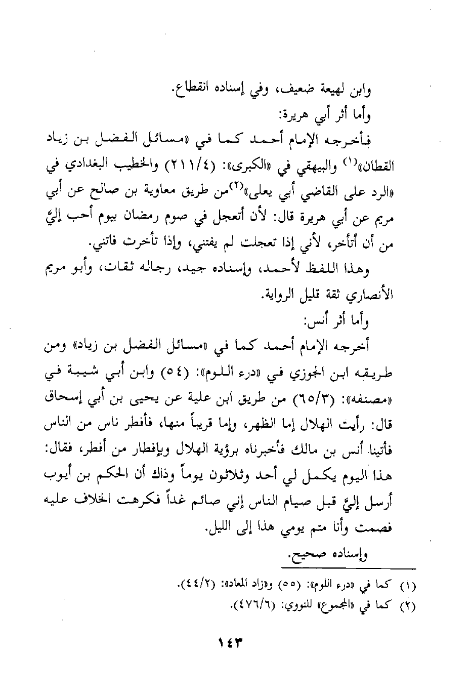 فأخرجه الإمام أحمد كما في "مسائل الفضل بن زياد" ومن طريقه ابن الجوزي في "درء اللوم": (54) وابن أبي شيبة في "مصنفه": (3/65) من طريق ابن علية عن يحيى بن أبي إسحاق قال: رأيت الهلال إما الظهر، وإما قريباً منها، فأفطر ناس من الناس فأتينا أنس بن مالك رضي الله عنه فأخبرناه برؤية الهلال وبإفطار من أفطر، فقال: هذا اليوم يكمل لي أحد وثلاثون يوماً وذاك أن الحكم بن أيوب أرسل إليَّ قبل صيام الناس إني صائم غداً فكرهت الخلاف عليه فصمت وأنا متم يومي هذا إلى الليل.