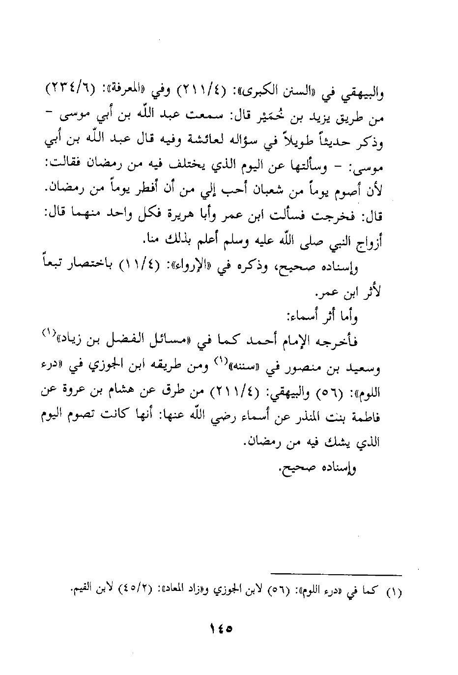 (55) والبيهقي في "السنن الكبرى": (4/211) وفي "المعرفة": (6/234) من طريق يزيد بن خُمَيْر قال: سمعت عبد الله بن أبي موسى - وذكر حديثاً طويلاً في سؤاله لعائشة وفيه قال عبد الله بن أبي موسى: - وسألتها عن اليوم الذي يختلف فيه من رمضان فقالت: لأن أصوم يوماً من شعبان أحب إلي من أن أفطر يوماً من رمضان. قال: فخرجت فسألت ابن عمر وأبا هريرة فكل واحد منهما قال: أزواج النبي صلى الله عليه وسلم أعلم بذلك منا.