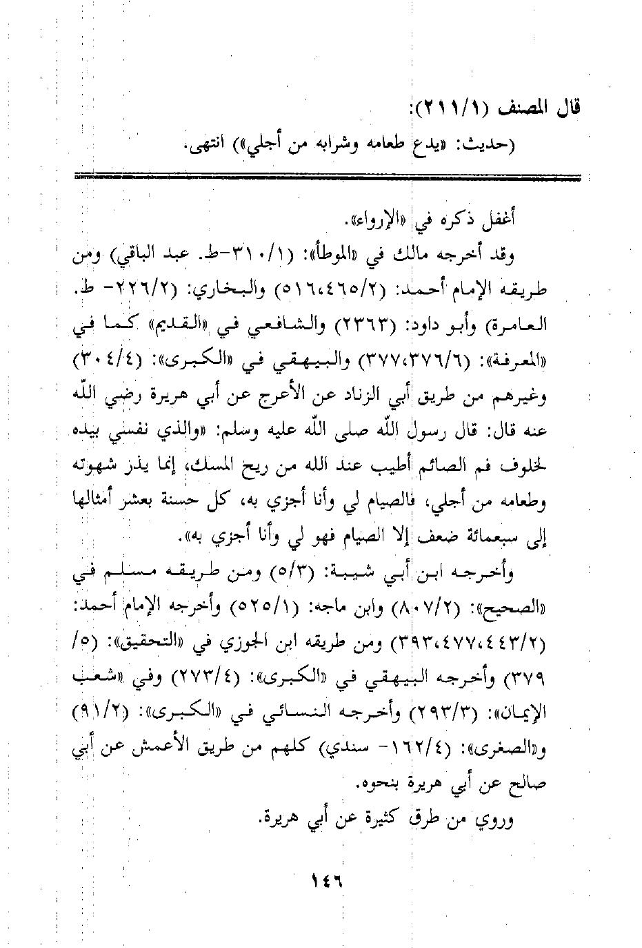 وقد أخرجه مالك في "الموطأ": (1/310 - ط. عبد الباقي) ومن طريقه الإمام أحمد: (2/465، 516) والبخاري: (2/226 - ط. العامرة) وأبو داود: (2363) والشافعي في "القديم" كما في "المعرفة": (6/376، 377) والبيهقي في "الكبرى": (4/304) وغيرهم من طريق أبي الزناد عن الأعرج عن أبي هريرة رضي الله عنه قال: قال رسول الله صلى الله عليه وسلم: "والذي نفسي بيده لخلوف فم الصائم أطيب عند الله من ريح المسك، إنما يذر شهوته وطعامه من أجلي، فالصيام لي وأنا أجزي به، كل حسنة بعشر أمثالها إلى سبعمائة ضعف إلا الصيام فهو لي وأنا أجزي به".