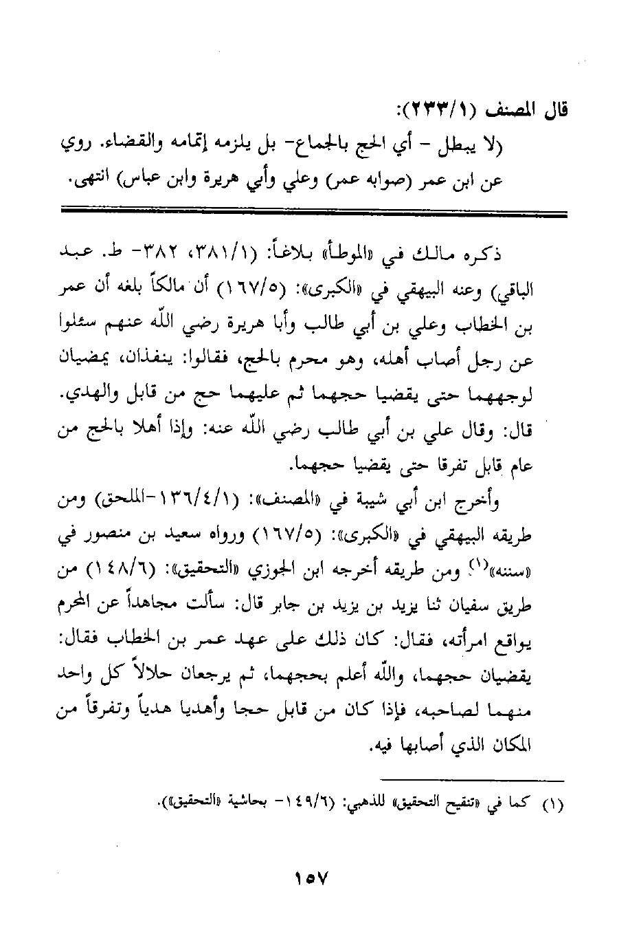 (لا يبطل - أي الحج بالجماع - بل يلزمه إتمامه والقضاء. روي عن ابن عمر (صوابه عمر) وعلي وأبي هريرة وابن عباس) انتهى.