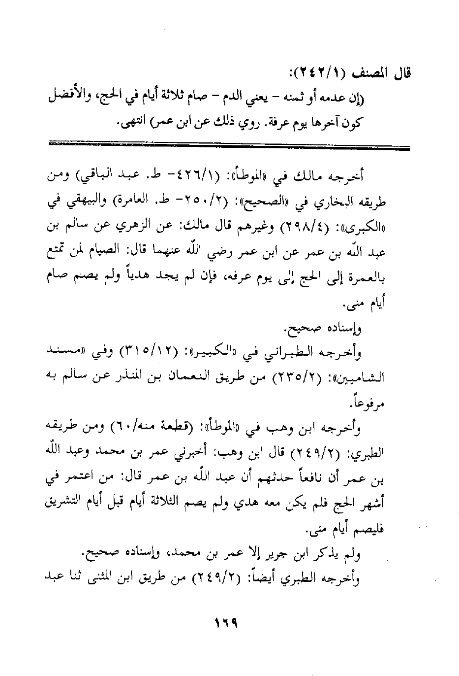 أخرجه مالك في "الموطأ": (1/426- ط. عبد الباقي) ومن طريقه البخاري في "الصحيح": (2/250- ط. العامرة) والبيهقي في "الكبرى": (4/298) وغيرهم قال مالك: عن الزهري عن سالم بن عبد الله بن عمر عن ابن عمر رضي الله عنهما قال: الصيام لمن تمتع بالعمرة إلى الحج إلى يوم عرفه، فإن لم يجد هدياً ولم يصم صام أيام منى.