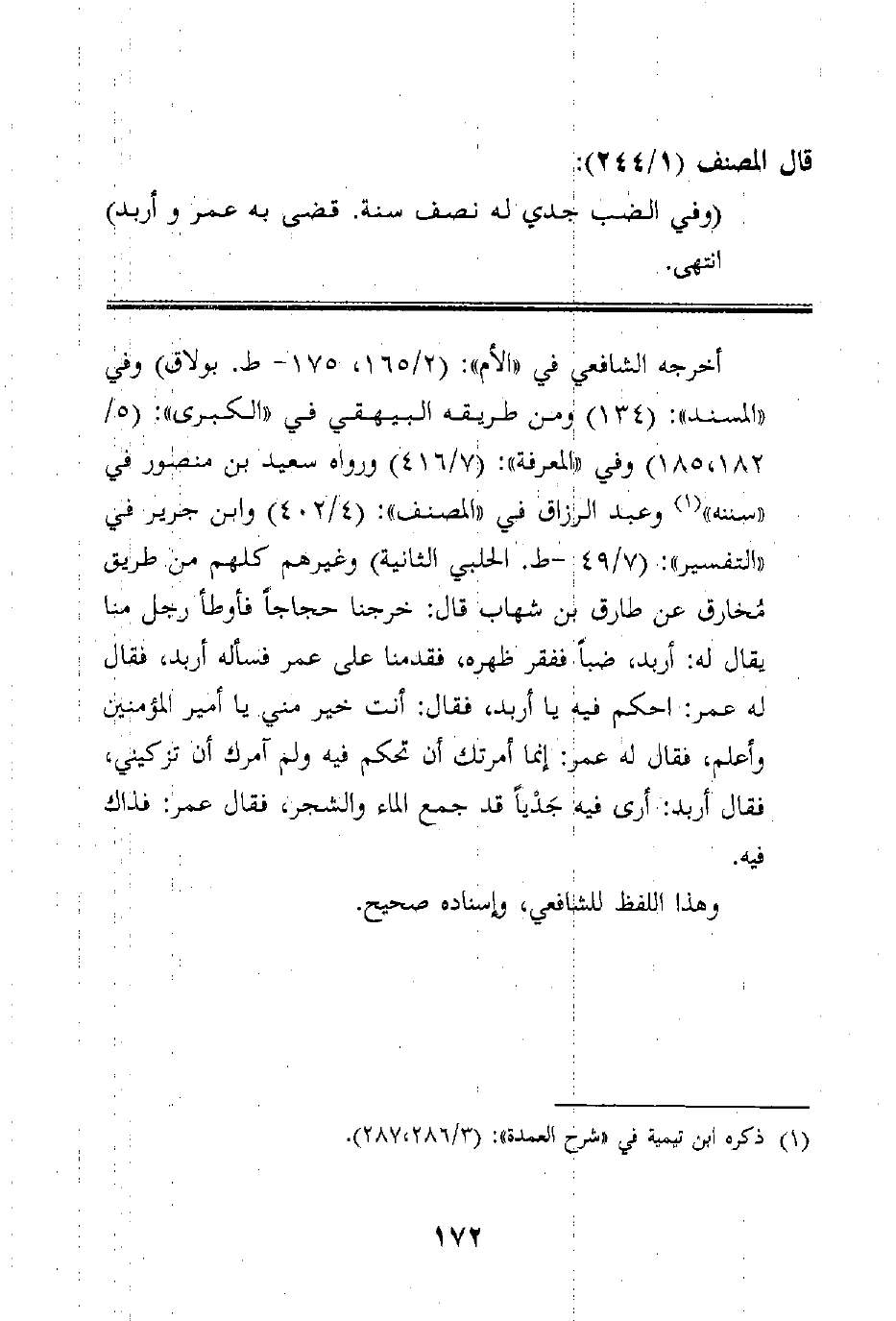 أخرجه الشافعي في "الأم": (2/165، 175- ط. بولاق) وفي "المسند": (134) ومن طريقه البيهقي في "الكبرى": (5/182، 185) وفي "المعرفة": (7/416) ورواه سعيد بن منصور في "سننه" وعبد الرزاق في "المصنف": (4/402) وابن جرير في "التفسير": (7/49 -ط. الحلبي الثانية) وغيرهم كلهم من طريق مُخارق عن طارق بن شهاب قال: خرجنا حجاجاً فأوطأ رجل منا يقال له: أربد، ضباً ففقر ظهره، فقدمنا على عمر فسأله أربد، فقال له عمر: احكم فيه يا أربد، فقال: أنت خير مني يا أمير المؤمنين وأعلم، فقال له عمر: إنما أمرتك أن تحكم فيه ولم آمرك أن تزكيني، فقال أربد: أرى فيه جَدْياً قد جمع الماء والشجر، فقال عمر: فذاك فيه.