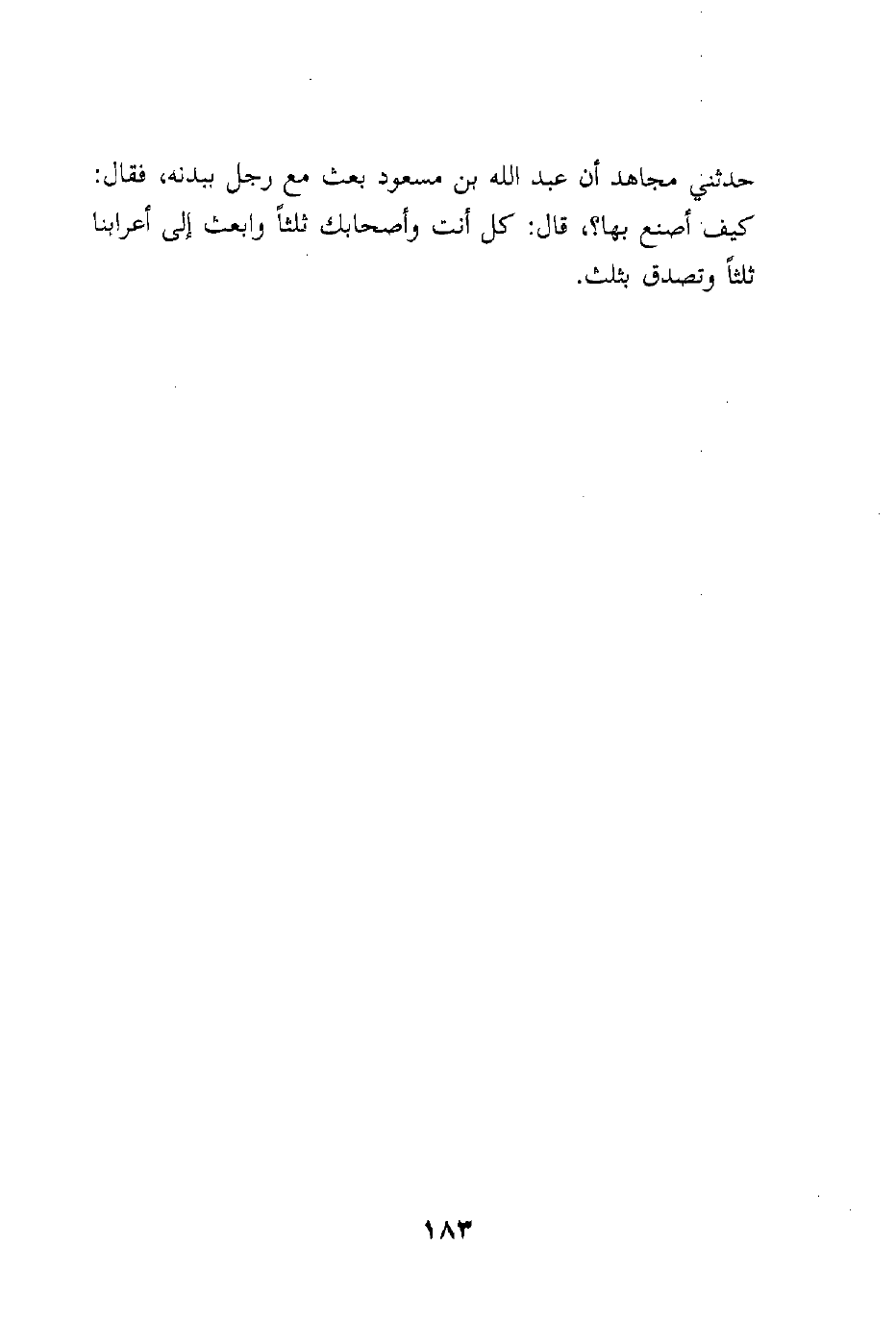 حدثني مجاهد أن عبد الله بن مسعود بعث مع رجل ببدنه، فقال: كيف أصنع بها؟، قال: كل أنت وأصحابك ثلثاً وابعث إلى أعرابنا ثلثاً وتصدق بثلث.