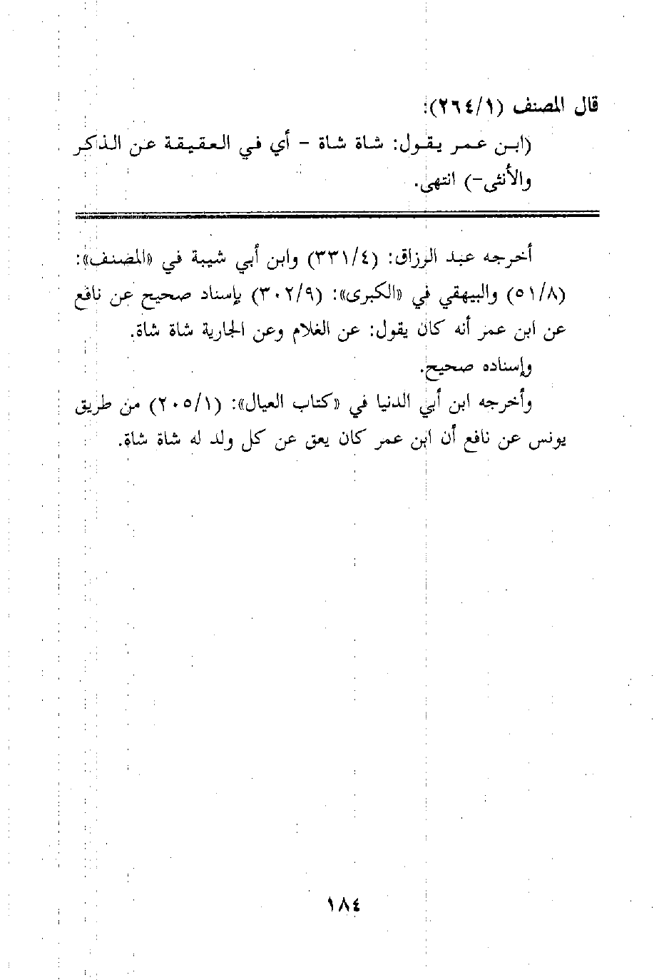 أخرجه عبد الرزاق: (4/331) وابن أبي شيبة في "المصنف": (8/51) والبيهقي في "الكبرى": (9/302) بإسناد صحيح عن نافع عن ابن عمر أنه كان يقول: عن الغلام وعن الجارية شاة شاة.
