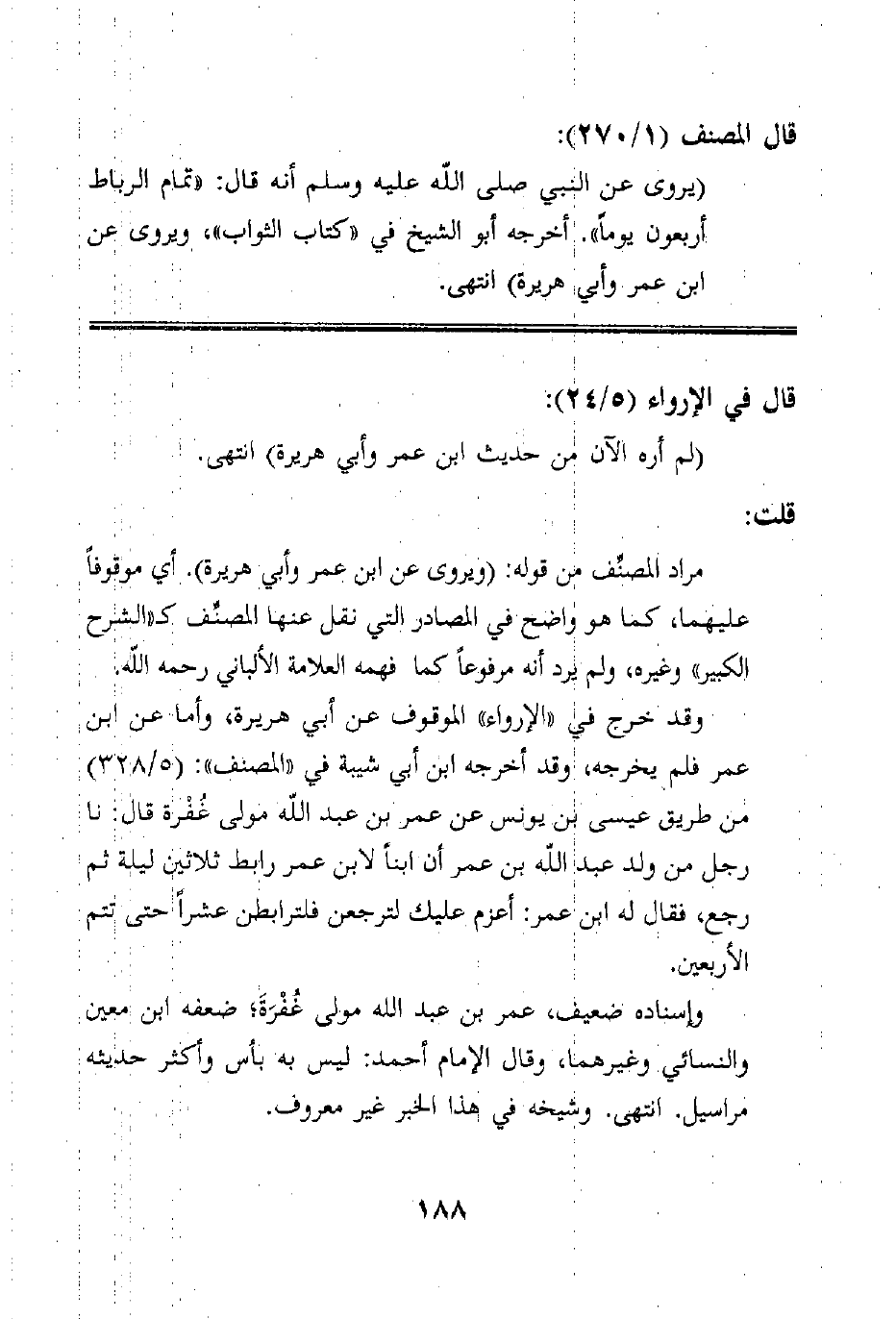 (يروى عن النبي صلى الله عليه وسلم أنه قال: "تمام الرباط أربعون يوماً". أخرجه أبو الشيخ في "كتاب الثواب"، ويروى عن ابن عمر وأبي هريرة) انتهى.