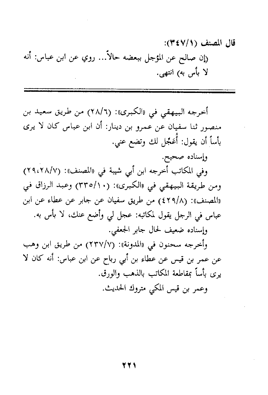 وفي المكاتب أخرجه ابن أبي شيبة في "المصنف": (7/28، 29) ومن طريقة البيهقي في "الكبرى": (10/335) وعبد الرزاق في "المصنف": (8/429) من طريق سفيان عن جابر عن عطاء عن ابن عباس في الرجل يقول لمكاتبه: عجل لي وأضع عنك، لا بأس به.