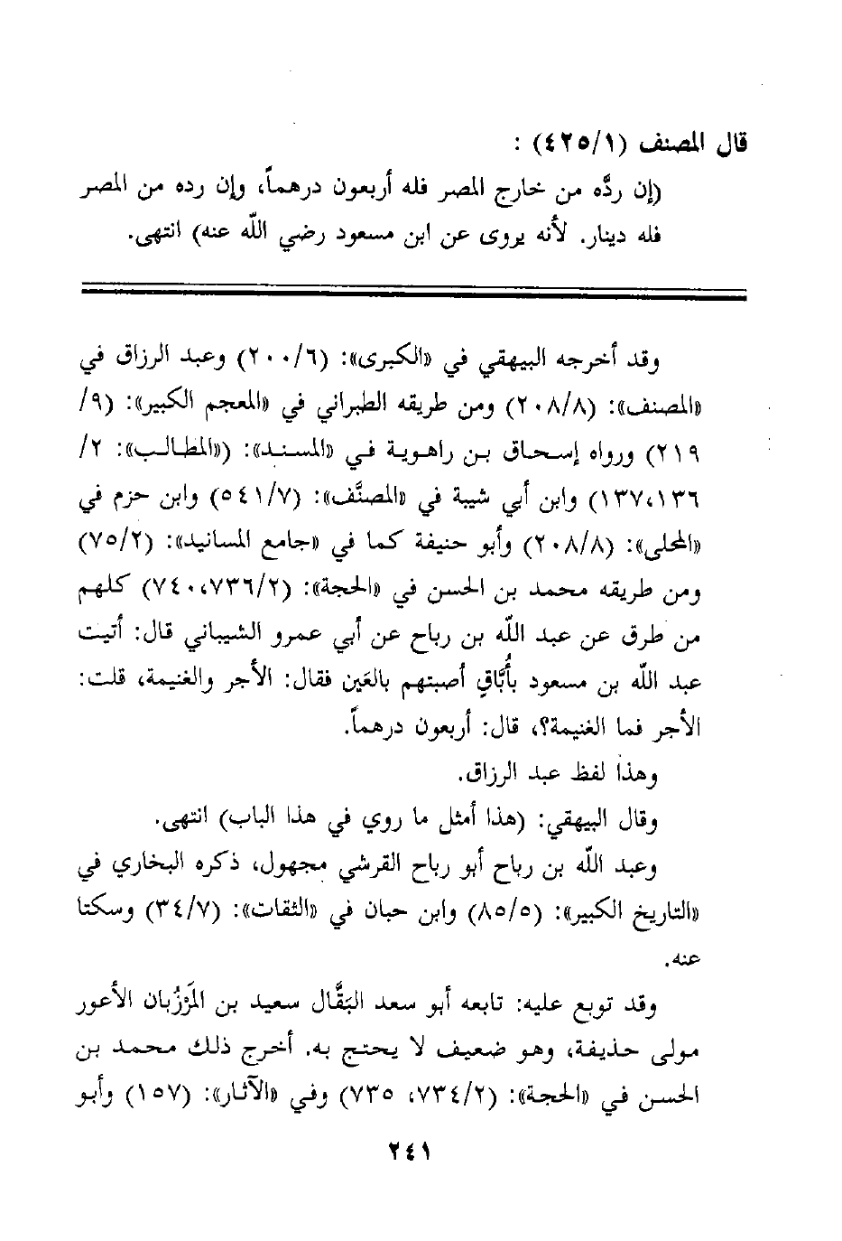 وقد أخرجه البيهقي في "الكبرى": (6/200) وعبد الرزاق في "المصنف": (8/208) ومن طريقه الطبراني في "المعجم الكبير": (9/219) ورواه إسحاق بن راهوية في "المسند": ("المطالب": 2/136، 137) وابن أبي شيبة في "المصنَّف": (7/541) وابن حزم في "المحلى": (8/208) وأبو حنيفة كما في "جامع المسانيد": (2/75) ومن طريقه محمد بن الحسن في "الحجة": (2/736، 740) كلهم من طرق عن عبد الله بن رباح عن أبي عمرو الشيباني قال: أتيت عبد الله بن مسعود بأُبَّاقٍ أصبتهم بالعَين فقال: الأجر والغنيمة، قلت: الأجر فما الغنيمة؟، قال: أربعون درهماً.