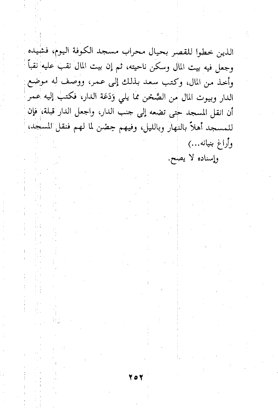 الذين خطوا للقصر بحيال محراب مسجد الكوفة اليوم، فشيده وجعل فيه بيت المال وسكن ناحيته، ثم إن بيت المال نقب عليه نقباً وأخذ من المال، وكتب سعد بذلك إلى عمر، ووصف له موضع الدار وبيوت المال من الصَّحْن مما يلي وَدَعَة الدار، فكتب إليه عمر أن انقل المسجد حتى تضعه إلى جنب الدار، واجعل الدار قبلة، فإن للمسجد أهلاً بالنهار وبالليل، وفيهم حِصْن لما لهم فنقل المسجد، وأراغ بنيانه ... )