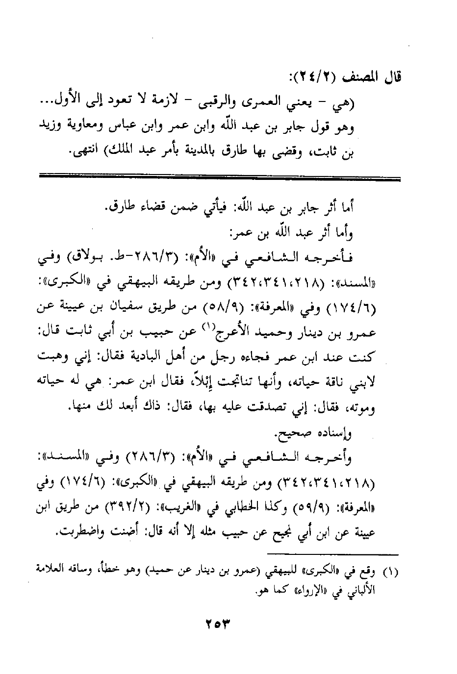 (هي - يعني العمرى والرقبى - لازمة لا تعود إلى الأول ... وهو قول جابر بن عبد الله وابن عمر وابن عباس ومعاوية وزيد بن ثابت، وقضى بها طارق بالمدينة بأمر عبد الملك) انتهى.
