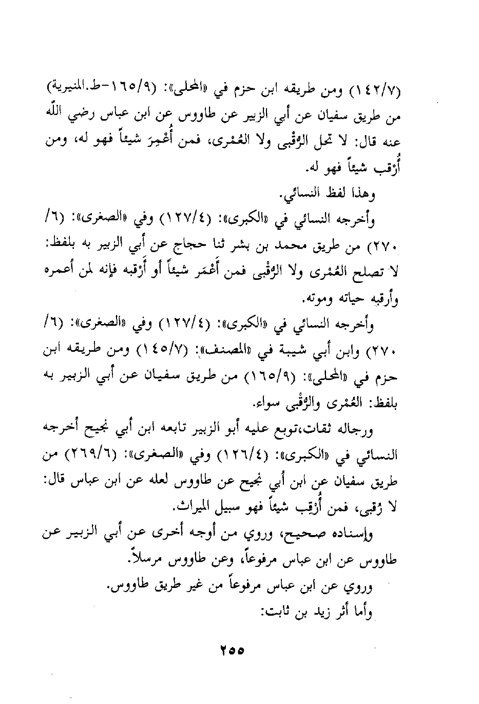 (7/142) ومن طريقه ابن حزم في "المحلى": (9/165 - ط. المنيرية) من طريق سفيان عن أبي الزبير عن طاووس عن ابن عباس رضي الله عنه قال: لا تحل الرُّقْبى ولا العُمْرى، فمن أُعْمِرَ شيئاً فهو له، ومن أُرْقب شيئاً فهو له.