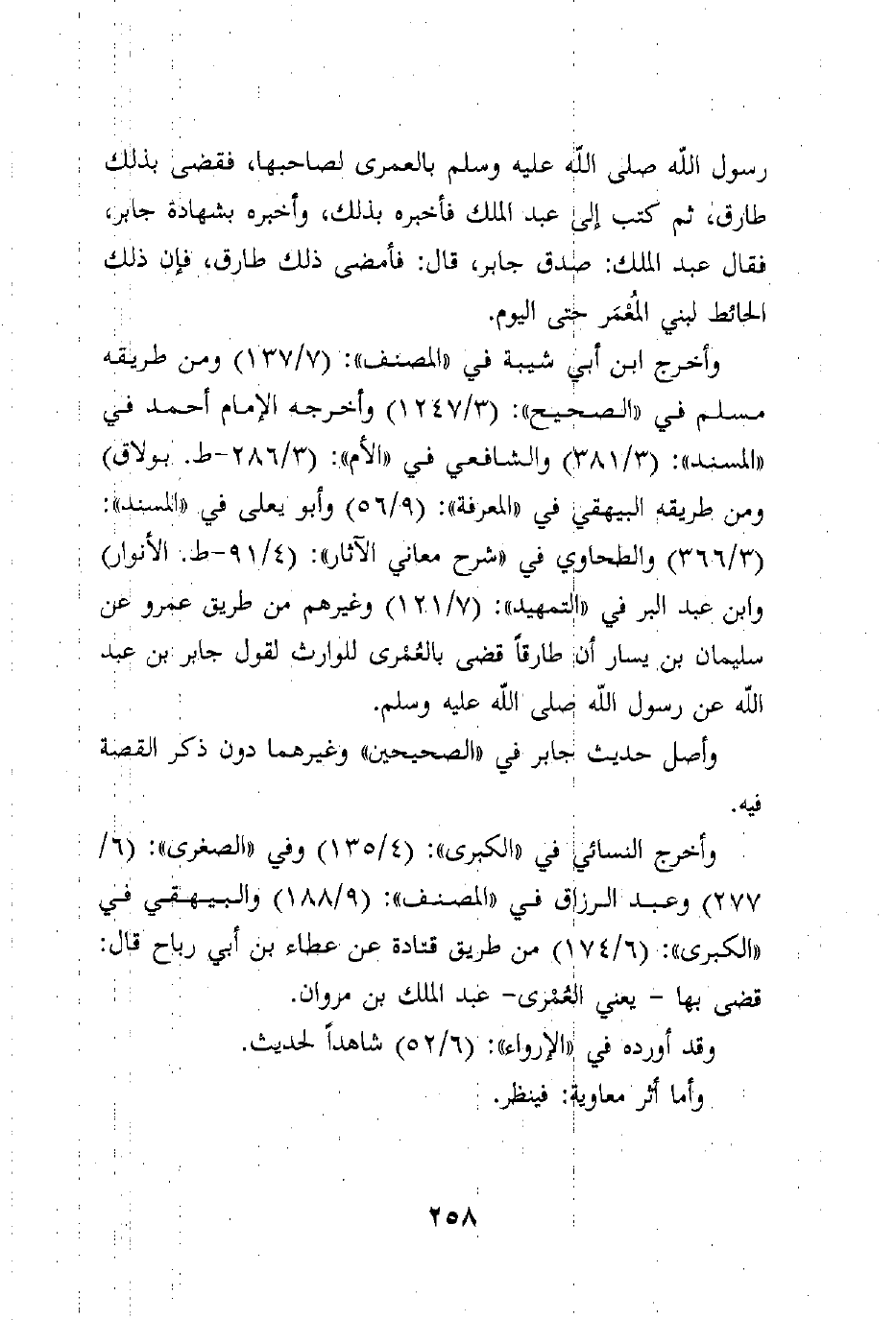 وأخرج ابن أبي شيبة في "المصنف": (7/137) ومن طريقه مسلم في "الصحيح": (3/1247) وأخرجه الإمام أحمد في "المسند": (3/381) والشافعي في "الأم": (3/286 - ط. بولاق) ومن طريقه البيهقي في "المعرفة": (9/56) وأبو يعلى في "المسند": (3/366) والطحاوي في "شرح معاني الآثار": (4/91 - ط. الأنوار) وابن عبد البر في "التمهيد": (7/121) وغيرهم من طريق عمرو عن سليمان بن يسار أن طارقاً قضى بالعُمْرى للوارث لقول جابر بن عبد الله عن رسول الله صلى الله عليه وسلم.