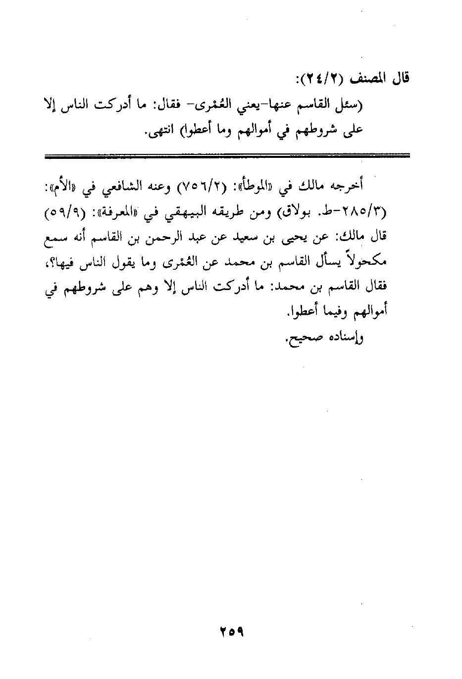 أخرجه مالك في "الموطأ": (2/756) وعنه الشافعي في "الأم": (3/285 - ط. بولاق) ومن طريقه البيهقي في "المعرفة": (9/59) قال مالك: عن يحيى بن سعيد عن عبد الرحمن بن القاسم أنه سمع مكحولاً يسأل القاسم بن محمد عن العُمْرى وما يقول الناس فيها؟، فقال القاسم بن محمد: ما أدركت الناس إلا وهم على شروطهم في أموالهم وفيما أعطوا.