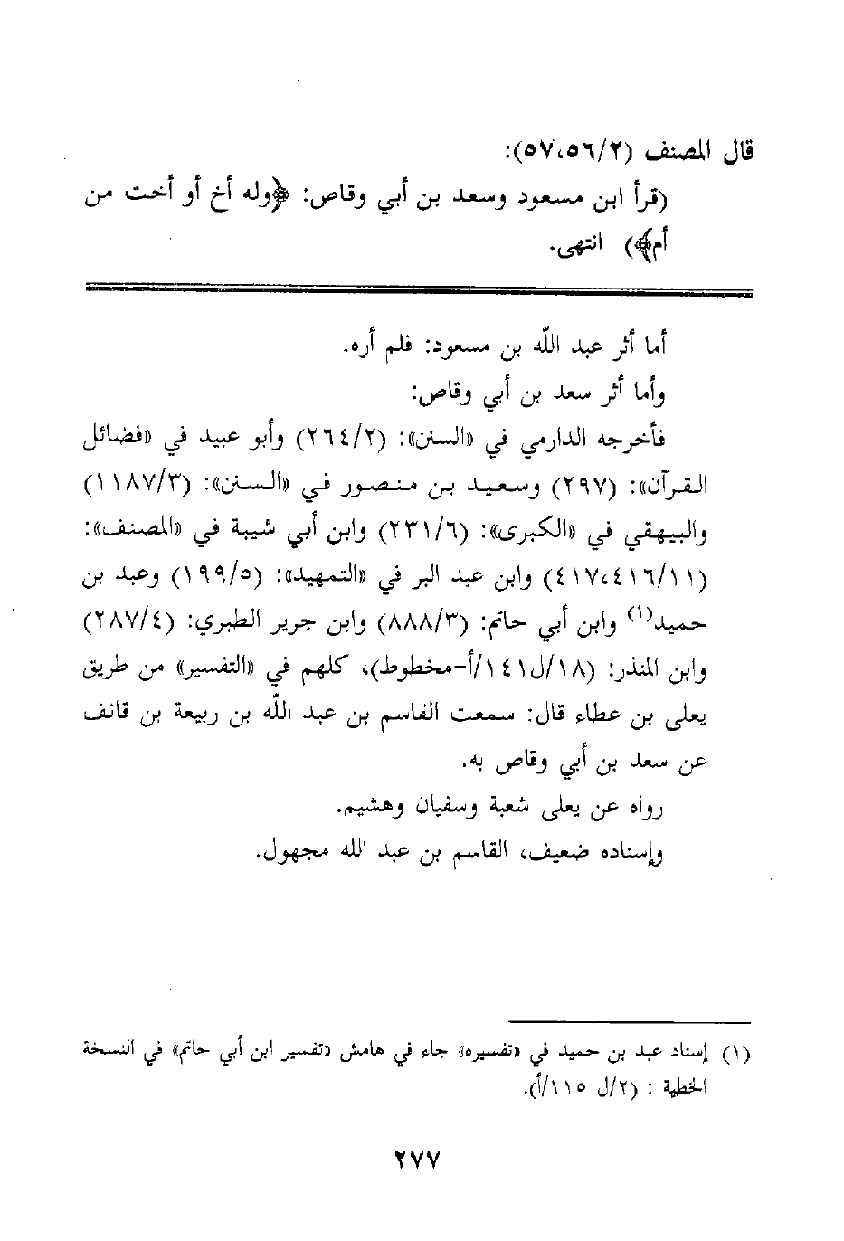 فأخرجه الدارمي في "السنن": (2/264) وأبو عبيد في "فضائل القرآن": (297) وسعيد بن منصور في "السنن": (3/1187) والبيهقي في "الكبرى": (6/231) وابن أبي شيبة في "المصنف": (11/416، 417) وابن عبد البر في "التمهيد": (5/199) وعبد بن حميد وابن أبي حاتم: (3/888) وابن جرير الطبري: (4/287) وابن المنذر: (18/ل141/أ-مخطوط) ، كلهم في "التفسير" من طريق يعلى بن عطاء قال: سمعت القاسم بن عبد الله بن ربيعة بن قانف عن سعد بن أبي وقاص به.