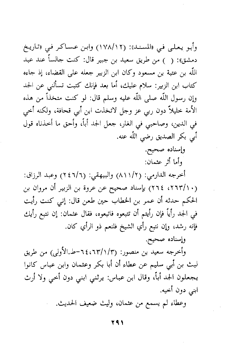 وأخرجه سعيد بن منصور: (3/1/63، 64-ط. الأولى) من طريق ليث بن أبي سليم عن عطاء أن أبا بكر وعثمان وابن عباس كانوا يجعلون الجد أباً، وقال ابن عباس: يرثني ابني دون أخي ولا أرث ابني دون أخيه.