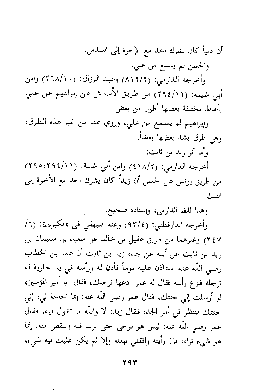 وأخرجه الدارقطني: (4/93) وعنه البيهقي في "الكبرى": (6/247) وغيرهما من طريق عقيل بن خالد عن سعيد بن سليمان بن زيد بن ثابت عن أبيه عن جده زيد بن ثابت أن عمر بن الخطاب رضي الله عنه استأذن عليه يوماً فأذن له ورأسه في يد جارية له ترجله فنزع رأسه فقال له عمر: دعها ترجلك، فقال: يا أمير المؤمنين، لو أرسلت إلي جئتك، فقال عمر رضي الله عنه: إنما الحاجة لي، إني جئتك لتنظر في أمر الجد، فقال زيد: لا والله ما تقول فيه، فقال عمر رضي الله عنه: ليس هو بوحي حتى نزيد فيه وننقص منه، إنما هو شيء تراه، فإن رأيته وافقني تبعته وإلا لم يكن عليك فيه شيء،