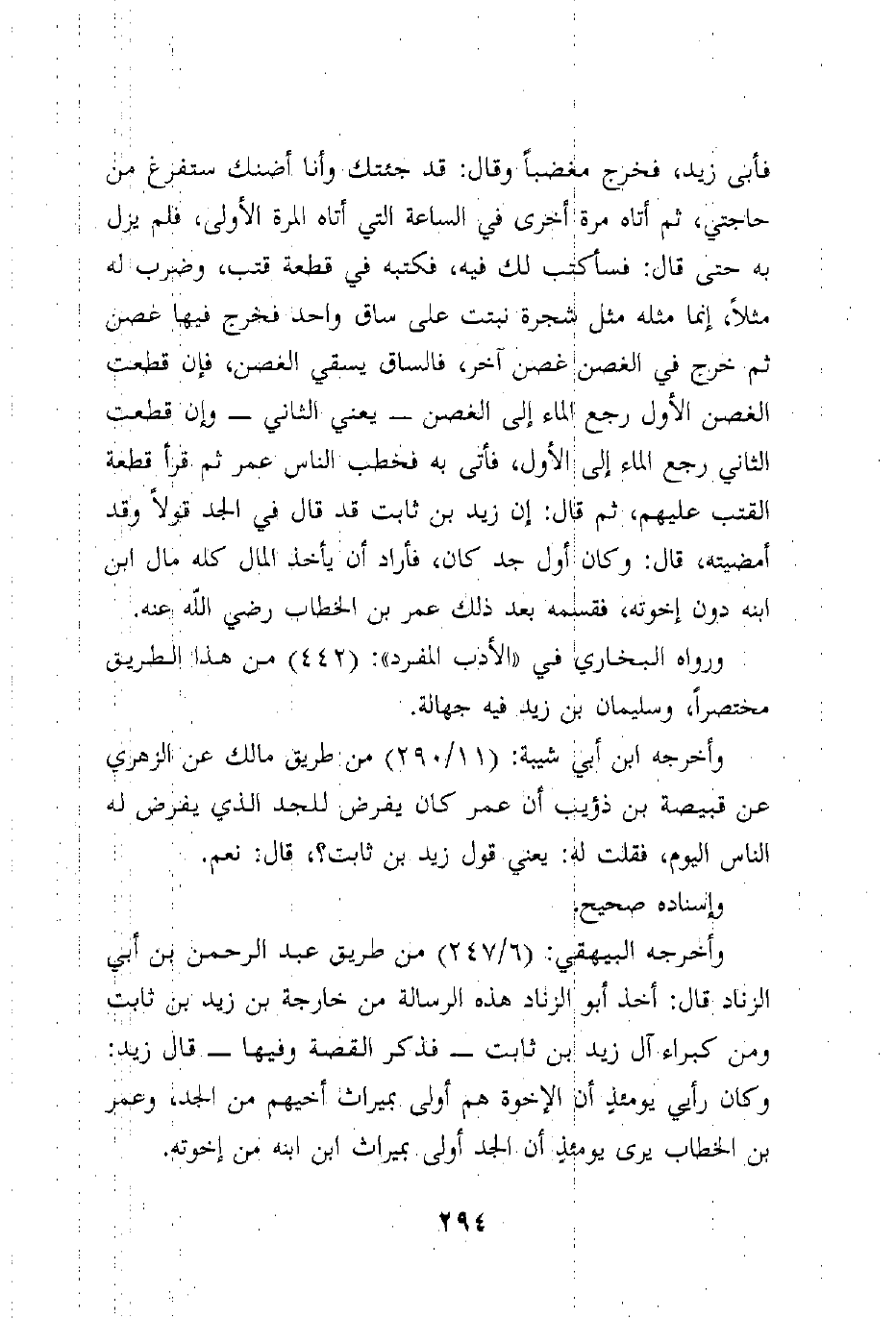 فأبى زيد، فخرج مغضباً وقال: قد جئتك وأنا أضنك ستفرغ من حاجتي، ثم أتاه مرة أخرى في الساعة التي أتاه المرة الأولى، فلم يزل به حتى قال: فسأكتب لك فيه، فكتبه في قطعة قتب، وضرب له مثلاً، إنما مثله مثل شجرة نبتت على ساق واحد فخرج فيها غصن ثم خرج في الغصن غصن آخر، فالساق يسقي الغصن، فإن قطعت الغصن الأول رجع الماء إلى الغصن _ يعني الثاني _ وإن قطعت الثاني رجع الماء إلى الأول، فأتى به فخطب الناس عمر ثم قرأ قطعة القتب عليهم، ثم قال: إن زيد بن ثابت قد قال في الجد قولاً وقد أمضيته، قال: وكان أول جد كان، فأراد أن يأخذ المال كله مال ابن ابنه دون إخوته، فقسمه بعد ذلك عمر بن الخطاب رضي الله عنه.