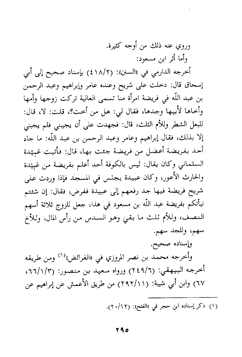 فأخرجه الدارمي في "السنن": (2/418) بإسناد صحيح إلى أبي إسحاق قال: دخلت على شريح وعنده عامر وإبراهيم وعبد الرحمن بن عبد الله في فريضة امرأة منا تسمى العالية تركت زوجها وأمها وأخاها لأبيها وجدها، فقال لي: هل من أخت؟، قلت: لا، قال: للبعل الشطر وللأم الثلث، قال: فجهدت على أن يجيبني فلم يجبني إلا بذلك، فقال إبراهيم وعامر وعبد الرحمن بن عبد الله: ما جاء أحد بفريضة أعضل من فريضة جئت بها، قال: فأتيت عَبِيْدة السلماني وكان يقال: ليس بالكوفة أحد أعلم بفريضة من عَبِيْدة والحارث الأعور، وكان عبيدة يجلس في المسجد فإذا وردت على شريح فريضة فيها جد رفعهم إلى عبيدة ففرض، فقال: إن شئتم نبأتكم بفريضة عبد الله بن مسعود في هذا، جعل للزوج ثلاثة أسهم النصف، وللأم ثلث ما بقي وهو السدس من رأس المال، وللأخ سهم، وللجد سهم.