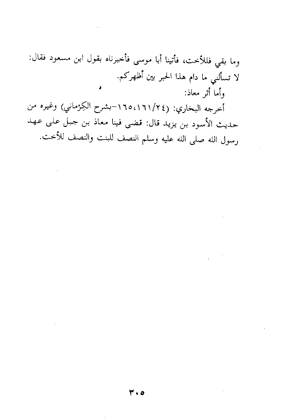 وما بقي فللأخت، فأتينا أبا موسى فأخبرناه بقول ابن مسعود فقال: لا تسألني ما دام هذا الحبر بين أظهركم.