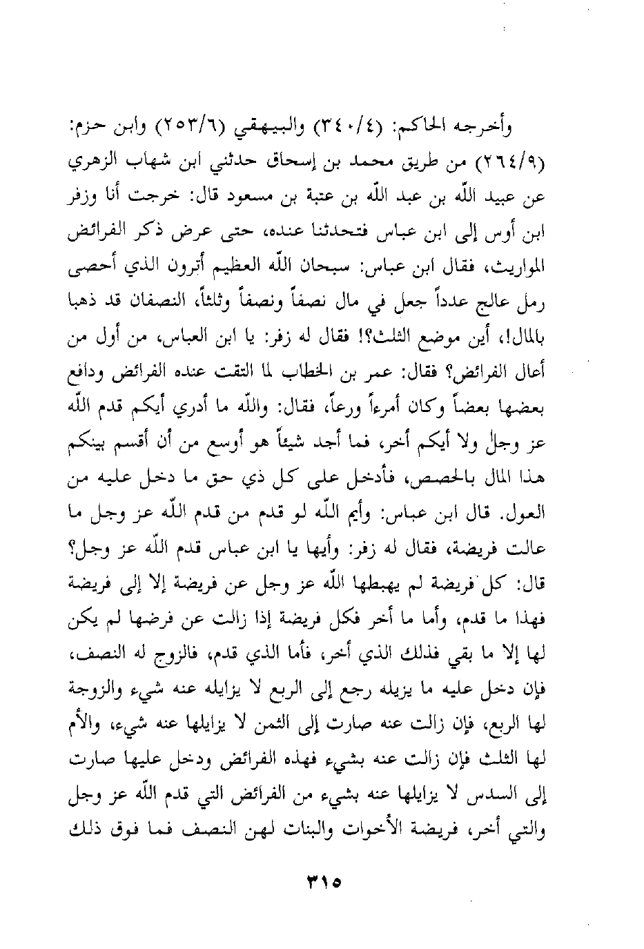 وأخرجه الحاكم: (4/340) والبيهقي (6/253) وابن حزم: (9/264) من طريق محمد بن إسحاق حدثني ابن شهاب الزهري عن عبيد الله بن عبد الله بن عتبة بن مسعود قال: خرجت أنا وزفر ابن أوس إلى ابن عباس فتحدثنا عنده، حتى عرض ذكر الفرائض المواريث، فقال ابن عباس: سبحان الله العظيم أترون الذي أحصى رمل عالج عدداً جعل في مال نصفاً ونصفاً وثلثاً، النصفان قد ذهبا بالمال!، أين موضع الثلث؟! فقال له زفر: يا ابن العباس، من أول من أعال الفرائض؟ فقال: عمر بن الخطاب لما التقت عنده الفرائض ودافع بعضها بعضاً وكان أمرءاً ورعاً، فقال: والله ما أدري أيكم قدم الله عز وجل ولا أيكم أخر، فما أجد شيئاً هو أوسع من أن أقسم بينكم هذا المال بالحصص، فأدخل على كل ذي حق ما دخل عليه من العول. قال ابن عباس: وأيم الله لو قدم من قدم الله عز وجل ما عالت فريضة، فقال له زفر: وأيها يا ابن عباس قدم الله عز وجل؟ قال: كل فريضة لم يهبطها الله عز وجل عن فريضة إلا إلى فريضة فهذا ما قدم، وأما ما أخر فكل فريضة إذا زالت عن فرضها لم يكن لها إلا ما بقي فذلك الذي أخر، فأما الذي قدم، فالزوج له النصف، فإن دخل عليه ما يزيله رجع إلى الربع لا يزايله عنه شيء والزوجة لها الربع، فإن زالت عنه صارت إلى الثمن لا يزايلها عنه شيء، والأم لها الثلث فإن زالت عنه بشيء فهذه الفرائض ودخل عليها صارت إلى السدس لا يزايلها عنه بشيء من الفرائض التي قدم الله عز وجل والتي أخر، فريضة الأخوات والبنات لهن النصف فما فوق ذلك