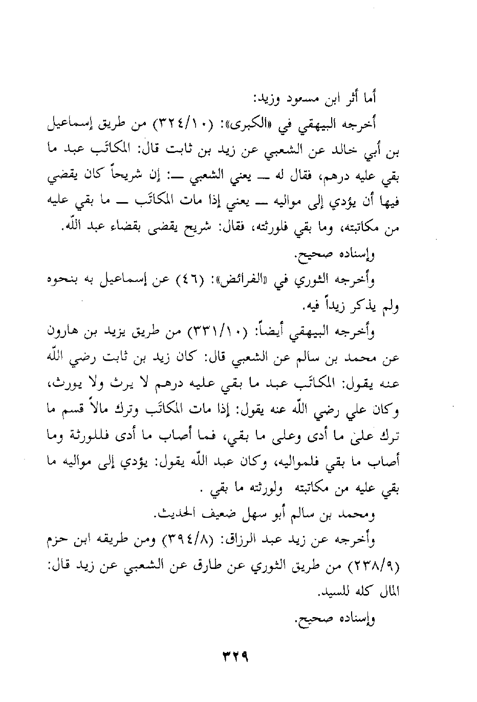 وأخرجه البيهقي أيضاً: (10/331) من طريق يزيد بن هارون عن محمد بن سالم عن الشعبي قال: كان زيد بن ثابت رضي الله عنه يقول: المكاتَب عبد ما بقي عليه درهم لا يرث ولا يورث، وكان علي رضي الله عنه يقول: إذا مات المكاتَب وترك مالاً قسم ما ترك على ما أدى وعلى ما بقي، فما أصاب ما أدى فللورثة وما أصاب ما بقي فلمواليه، وكان عبد الله يقول: يؤدي إلى مواليه ما بقي عليه من مكاتبته ولورثته ما بقي.