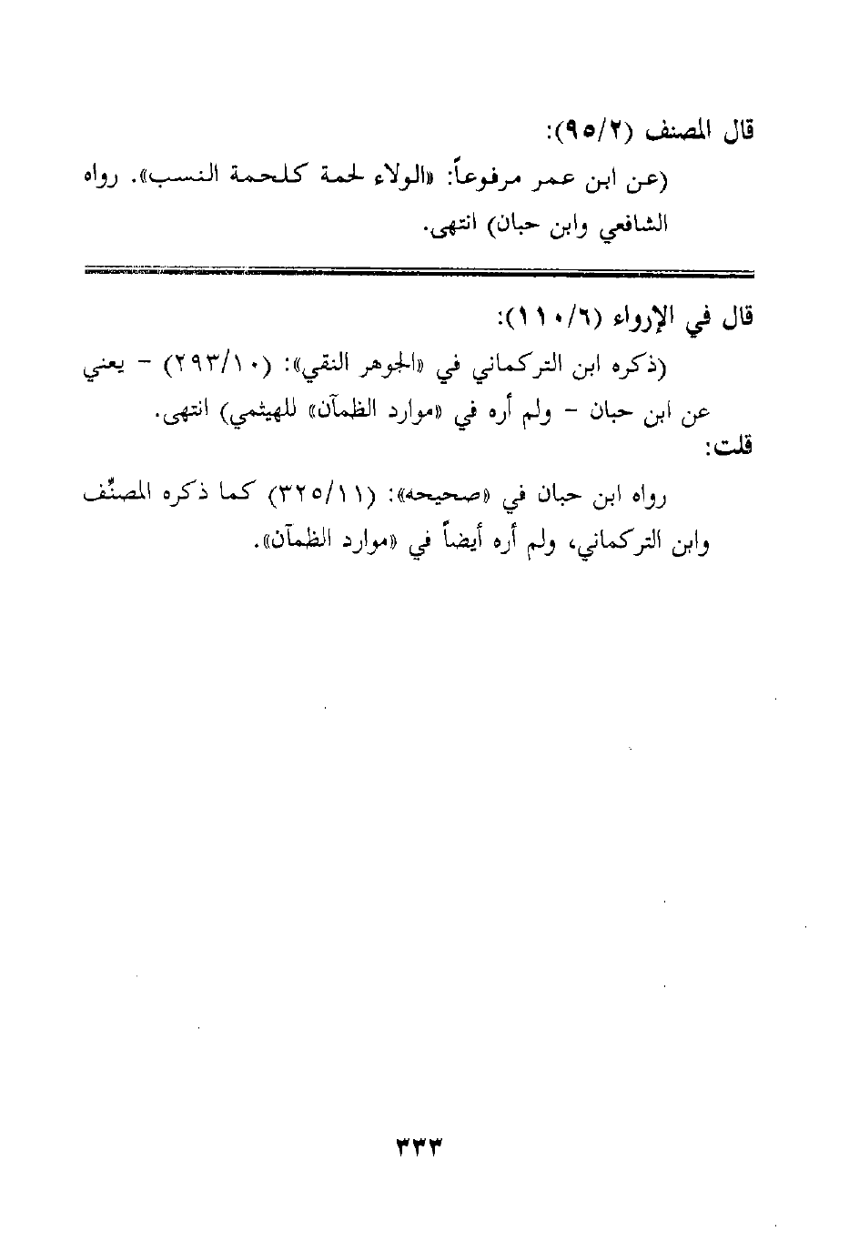(عن ابن عمر مرفوعاً: "الولاء لحمة كلحمة النسب". رواه الشافعي وابن حبان) انتهى.