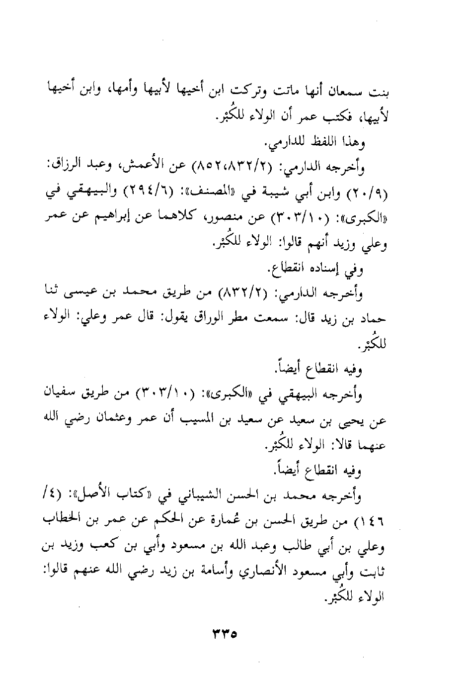 بنت سمعان أنها ماتت وتركت ابن أخيها لأبيها وأمها، وابن أخيها لأبيها، فكتب عمر أن الولاء للكُبْر.