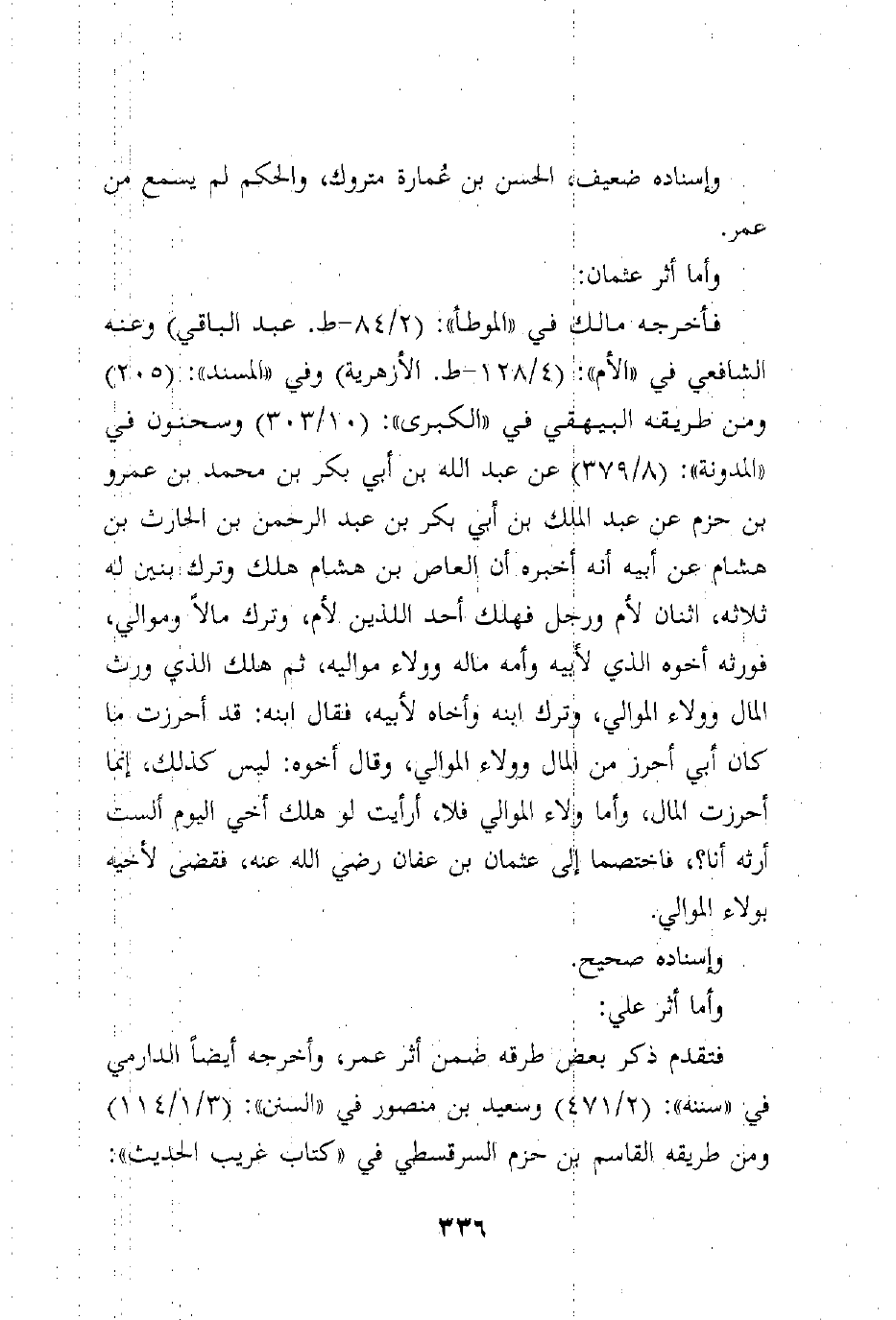 فأخرجه مالك في "الموطأ": (2/84 - ط. عبد الباقي) وعنه الشافعي في "الأم": (4/128 - ط. الأزهرية) وفي "المسند": (205) ومن طريقه البيهقي في "الكبرى": (10/303) وسحنون في "المدونة": (8/379) عن عبد الله بن أبي بكر بن محمد بن عمرو بن حزم عن عبد الملك بن أبي بكر بن عبد الرحمن بن الحارث بن هشام عن أبيه أنه أخبره أن العاص بن هشام هلك وترك بنين له ثلاثه، اثنان لأم ورجل فهلك أحد اللذين لأم، وترك مالاً وموالي، فورثه أخوه الذي لأبيه وأمه ماله وولاء مواليه، ثم هلك الذي ورث المال وولاء الموالي، وترك ابنه وأخاه لأبيه، فقال ابنه: قد أحرزت ما كان أبي أحرز من المال وولاء الموالي، وقال أخوه: ليس كذلك، إنما أحرزت المال، وأما ولاء الموالي فلا، أرأيت لو هلك أخي اليوم ألست أرثه أنا؟، فاختصما إلى عثمان بن عفان رضي الله عنه، فقضى لأخيه بولاء الموالي.