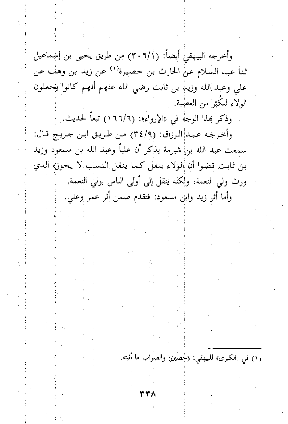 وأخرجه البيهقي أيضاً: (1/306) من طريق يحيى بن إسماعيل ثنا عبد السلام عن الحارث بن حصيرة عن زيد بن وهب عن علي وعبد الله وزيد بن ثابت رضي الله عنهم أنهم كانوا يجعلون الولاء للكُبْر من العصبة.