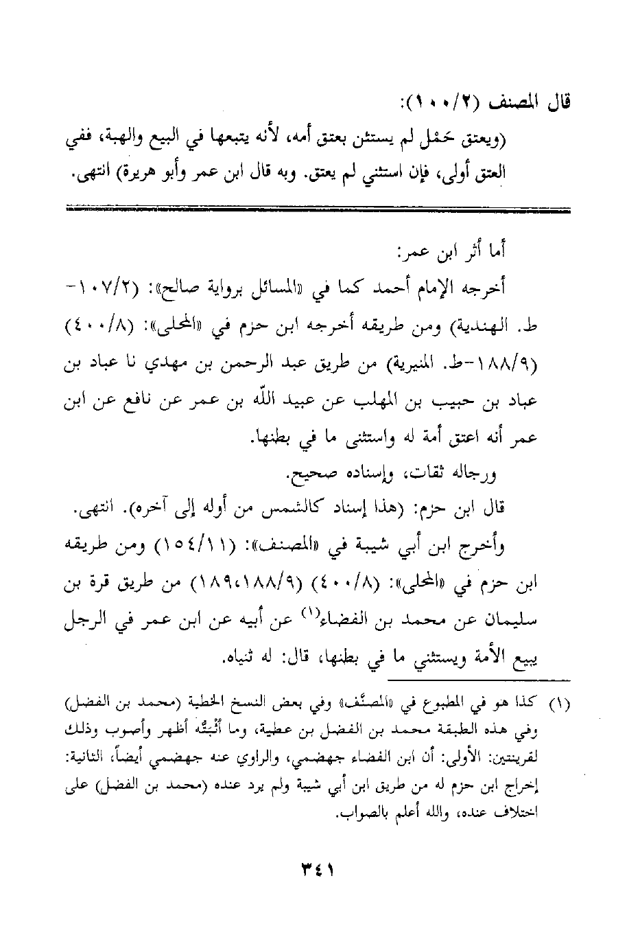 وأخرج ابن أبي شيبة في "المصنف": (11/154) ومن طريقه ابن حزم في "المحلى": (8/400) (9/188، 189) من طريق قرة بن سليمان عن محمد بن الفضاء عن أبيه عن ابن عمر في الرجل يبيع الأمة ويستثني ما في بطنها، قال: له ثنياه.