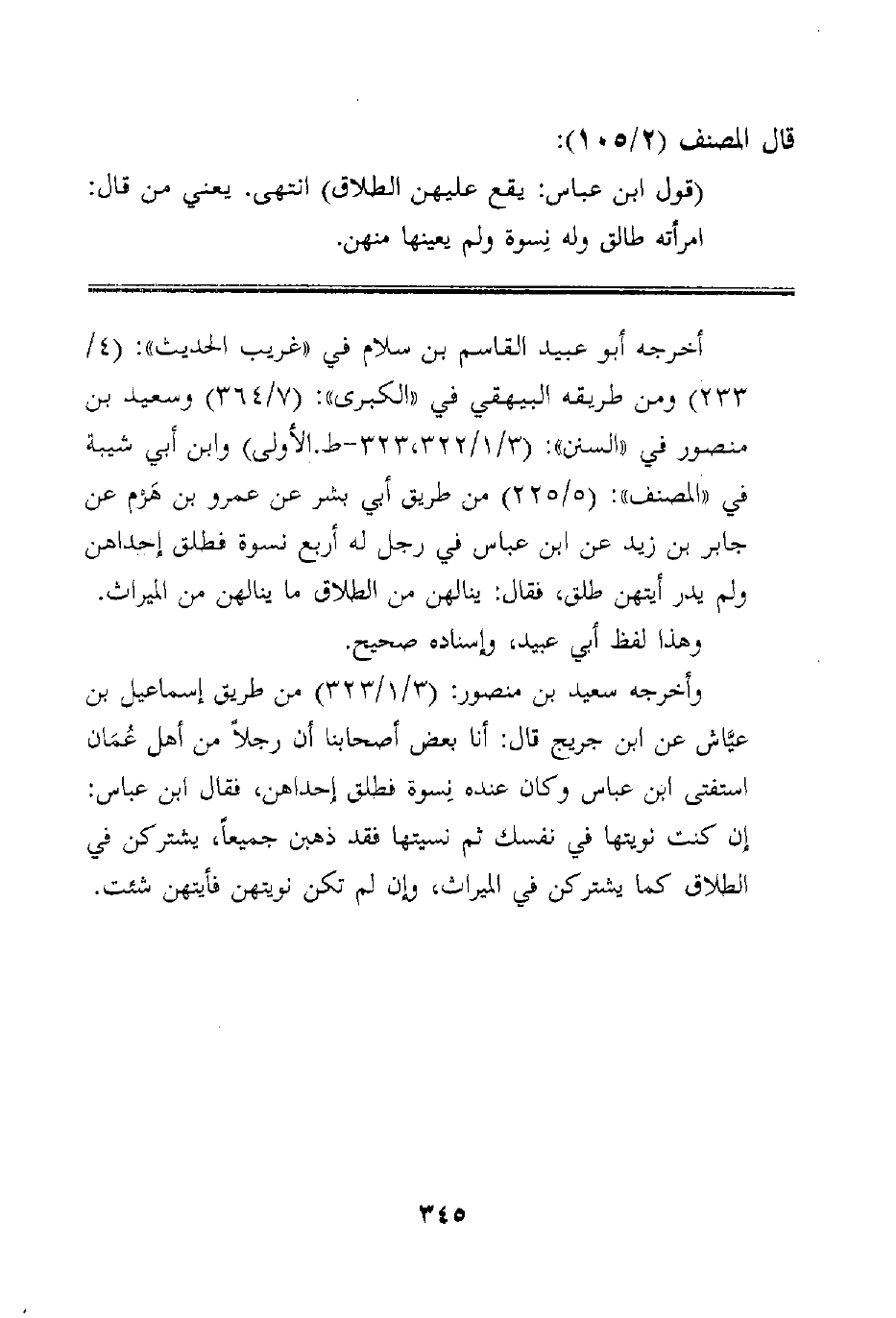 أخرجه أبو عبيد القاسم بن سلام في "غريب الحديث": (4/233) ومن طريقه البيهقي في "الكبرى": (7/364) وسعيد بن منصور في "السنن": (3/1/322، 323 - ط. الأولى) وابن أبي شيبة في "المصنف": (5/225) من طريق أبي بشر عن عمرو بن هَرْم عن جابر بن زيد عن ابن عباس في رجل له أربع نسوة فطلق إحداهن ولم يدر أيتهن طلق، فقال: ينالهن من الطلاق ما ينالهن من الميراث.
