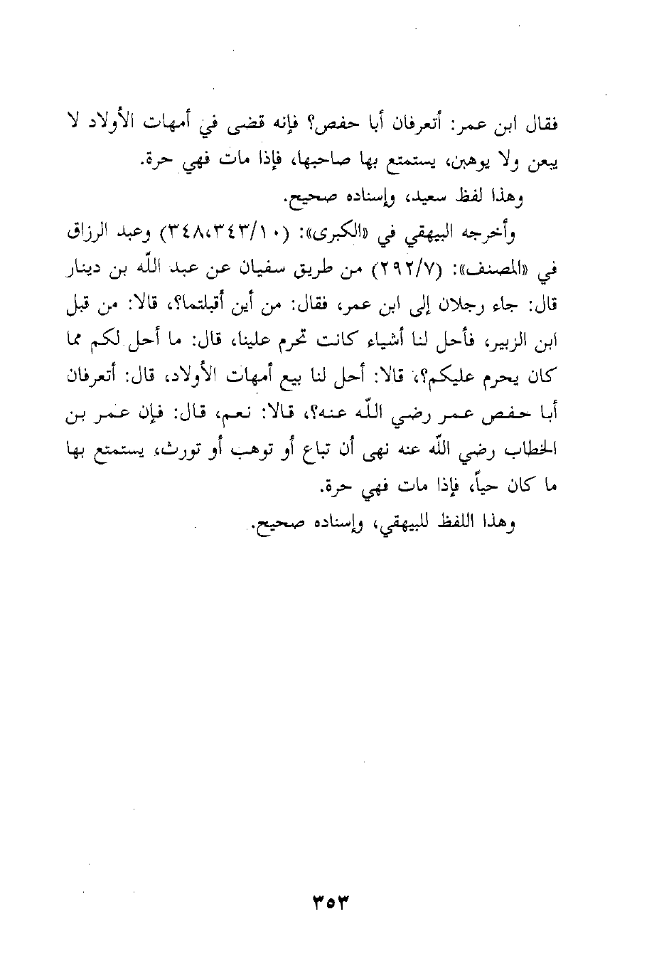 فقال ابن عمر: أتعرفان أبا حفص؟ فإنه قضى في أمهات الأولاد لا يبعن ولا يوهبن، يستمتع بها صاحبها، فإذا مات فهي حرة.