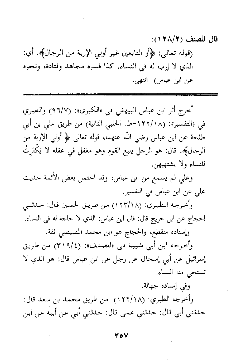 أخرج أثر ابن عباس البيهقي في "الكبرى": (7/96) والطبري في "التفسير": (18/122 - ط. الحلبي الثانية) من طريق علي بن أبي طلحة عن ابن عباس رضي الله عنهما، قوله تعالى {أُولِي ... } . قال: هو الرجل يتبع القوم وهو مغفل في عقله لا يَكْتَرِثُ للنساء ولا يشتهيهن.
