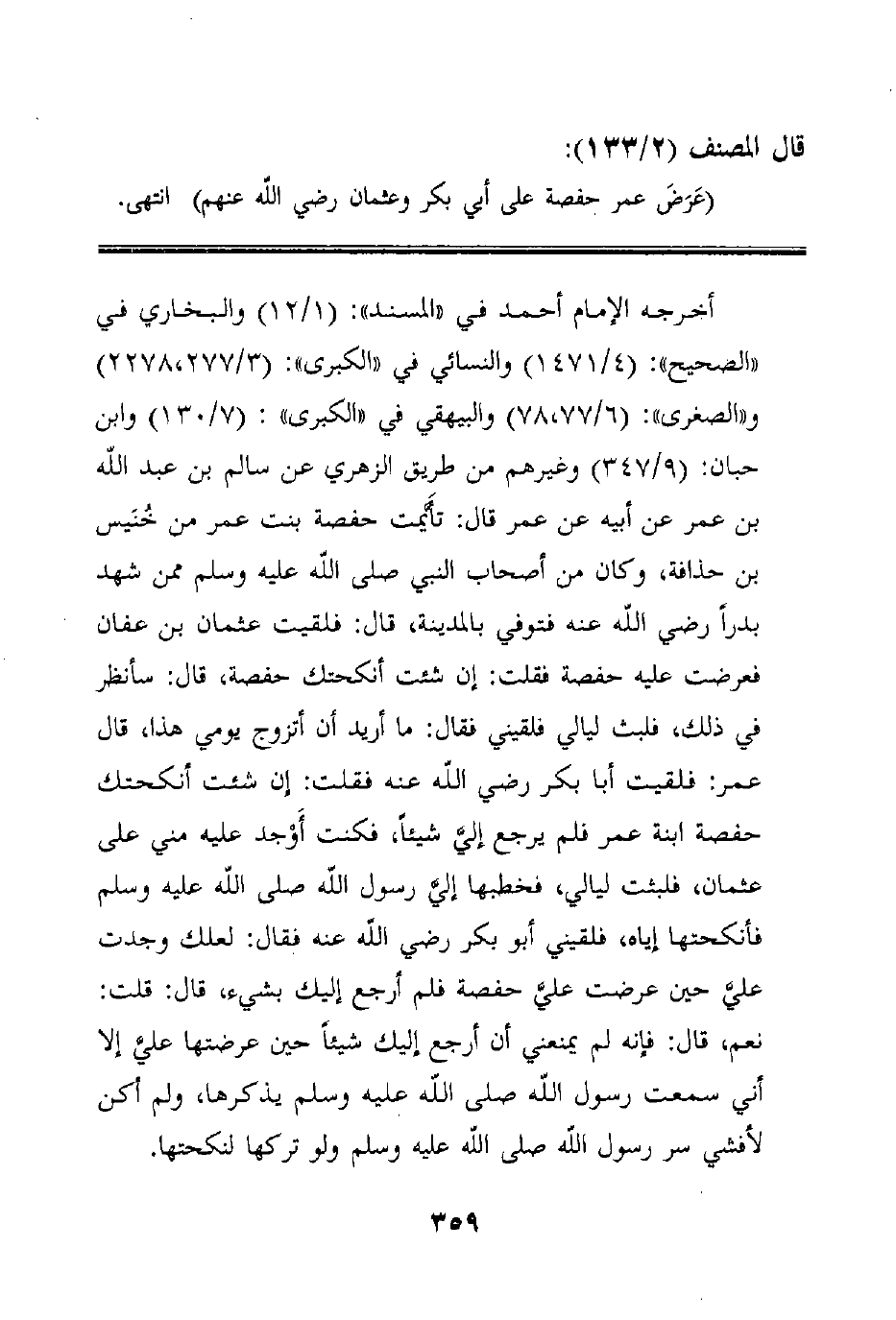 أخرجه الإمام أحمد في "المسند": (1/12) والبخاري في "الصحيح": (4/1471) والنسائي في "الكبرى": (3/277، 2278) و"الصغرى": (6/77، 78) والبيهقي في "الكبرى": (7/130) وابن حبان: (9/347) وغيرهم من طريق الزهري عن سالم بن عبد الله بن عمر عن أبيه عن عمر قال: تأَيَّمت حفصة بنت عمر من خُنَيس بن حذافة، وكان من أصحاب النبي صلى الله عليه وسلم ممن شهد بدراً رضي الله عنه فتوفي بالمدينة، قال: فلقيت عثمان بن عفان فعرضت عليه حفصة فقلت: إن شئت أنكحتك حفصة، قال: سأنظر في ذلك، فلبث ليالي فلقيني فقال: ما أريد أن أتزوج يومي هذا، قال عمر: فلقيت أبا بكر رضي الله عنه فقلت: إن شئت أنكحتك حفصة ابنة عمر فلم يرجع إليَّ شيئاً، فكنت أَوْجد عليه مني على عثمان، فلبثت ليالي، فخطبها إليَّ رسول الله صلى الله عليه وسلم فأنكحتها إياه، فلقيني أبو بكر رضي الله عنه فقال: لعلك وجدت عليَّ حين عرضت عليَّ حفصة فلم أرجع إليك بشيء، قال: قلت: نعم، قال: فإنه لم يمنعني أن أرجع إليك شيئاً حين عرضتها عليَّ إلا أني سمعت رسول الله صلى الله عليه وسلم يذكرها، ولم أكن لأفشي سر رسول الله صلى الله عليه وسلم ولو تركها لنكحتها.