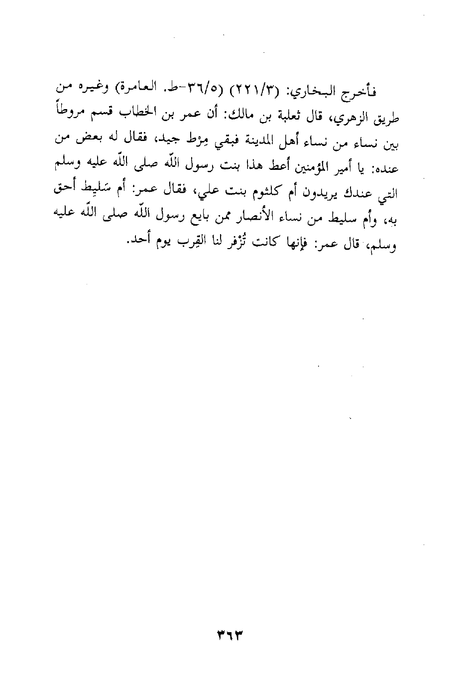 فأخرج البخاري: (3/221) (5/36 - ط. العامرة) وغيره من طريق الزهري، قال ثعلبة بن مالك: أن عمر بن الخطاب قسم مروطاً بين نساء من نساء أهل المدينة فبقي مِرْط جيد، فقال له بعض من عنده: يا أمير المؤمنين أعط هذا بنت رسول الله صلى الله عليه وسلم التي عندك يريدون أم كلثوم بنت علي، فقال عمر: أم سَليِط أحق به، وأم سليط من نساء الأنصار ممن بايع رسول الله صلى الله عليه وسلم، قال عمر: فإنها كانت تُزْفر لنا القِرب يوم أحد.