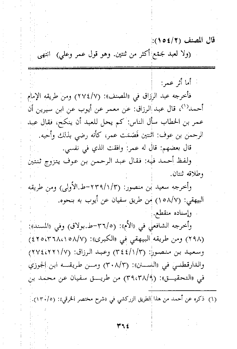 فأخرجه عبد الرزاق في "المصنف": (7/274) ومن طريقه الإمام أحمد، قال عبد الرزاق: عن معمر عن أيوب عن ابن سيرين أن عمر بن الخطاب سأل الناس: كم يحل للعبد أن ينكح، فقال عبد الرحمن بن عوف: اثنتين فَصَمَت عمر، كأنه رضي بذلك وأحبه.