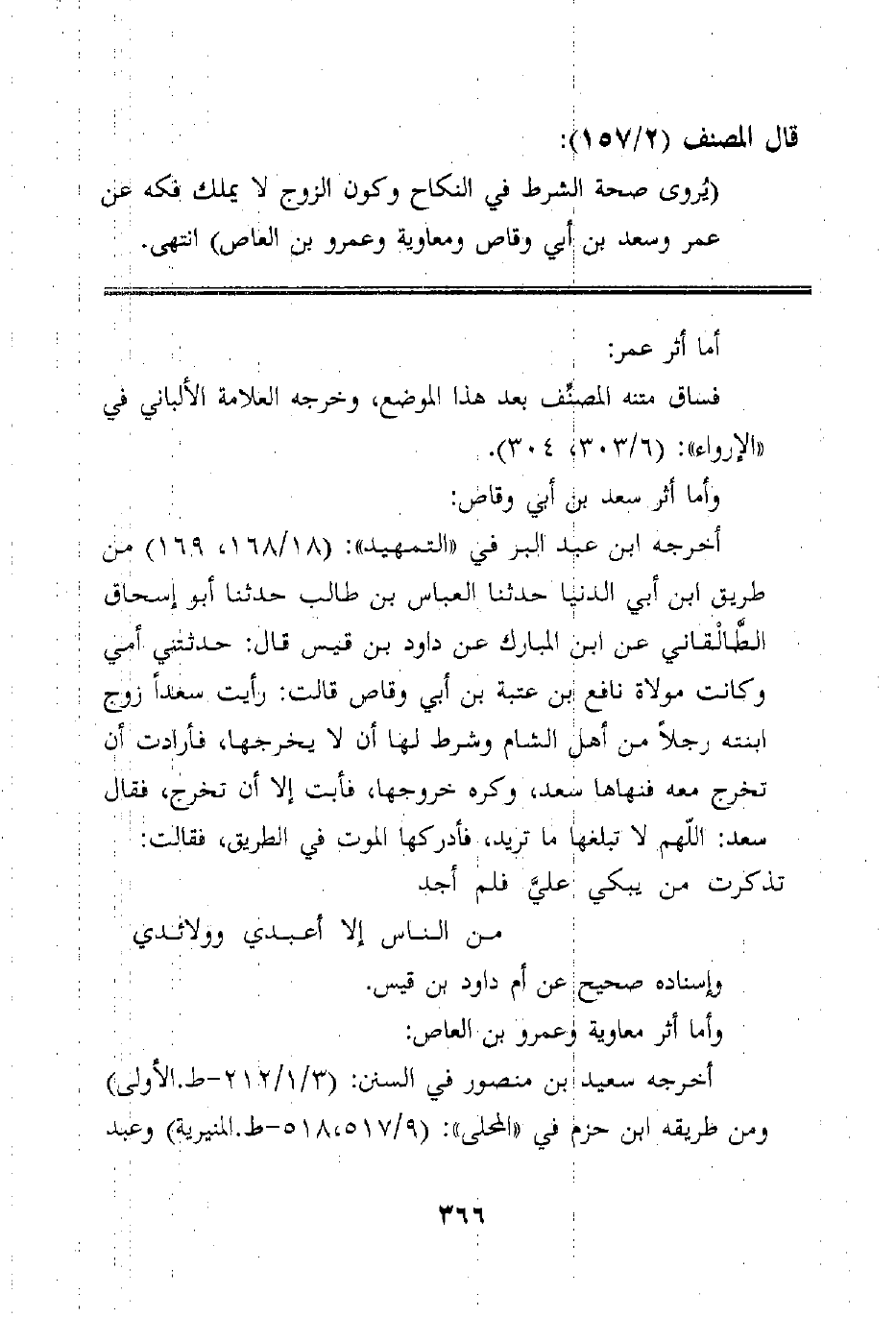 (يُروى صحة الشرط في النكاح وكون الزوج لا يملك فكه عن عمر وسعد بن أبي وقاص ومعاوية وعمرو بن العاص) انتهى.