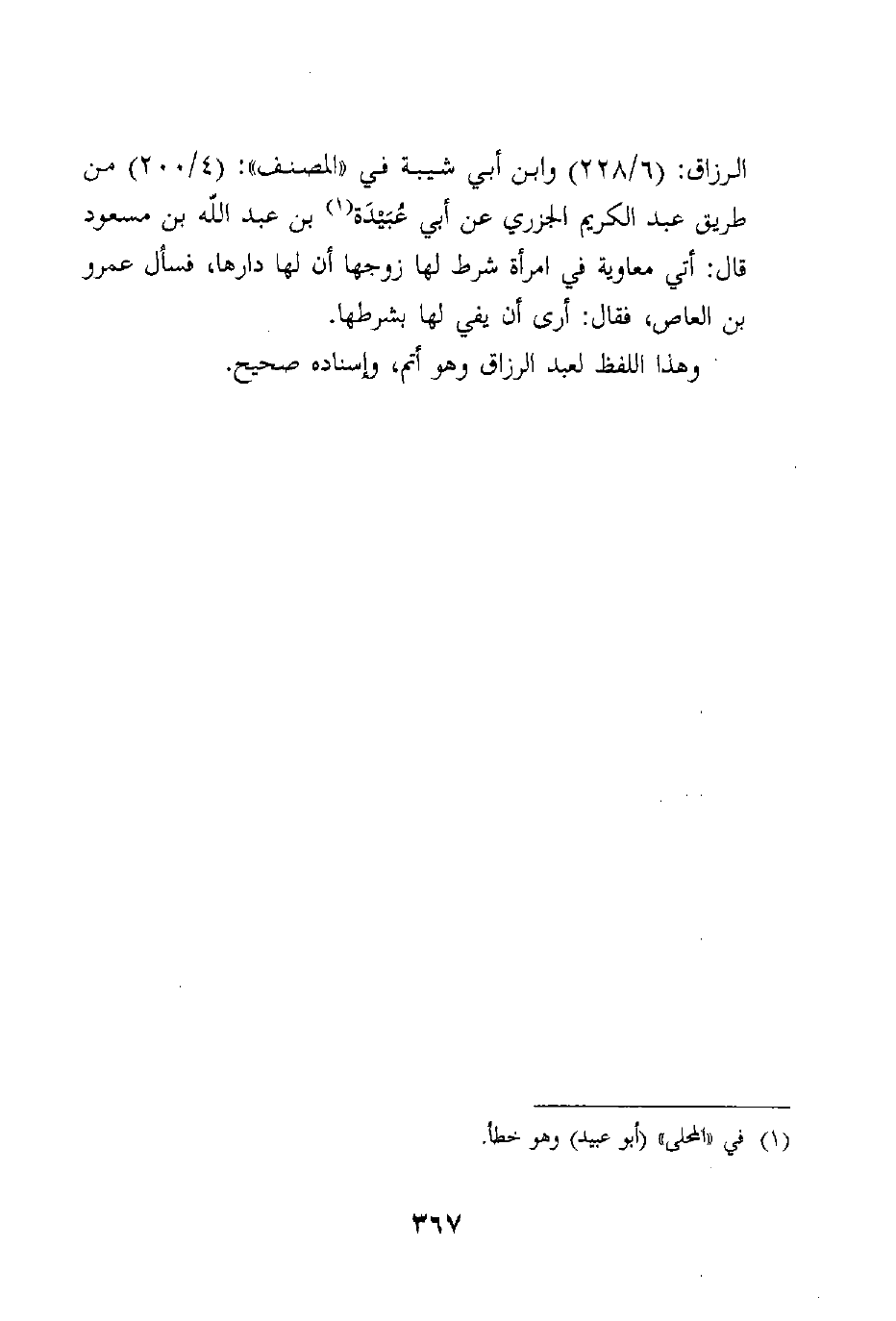 الرزاق: (6/228) وابن أبي شيبة في "المصنف": (4/200) من طريق عبد الكريم الجزري عن أبي عُبَيْدَة بن عبد الله بن مسعود قال: أتي معاوية في امرأة شرط لها زوجها أن لها دارها، فسأل عمرو بن العاص، فقال: أرى أن يفي لها بشرطها.