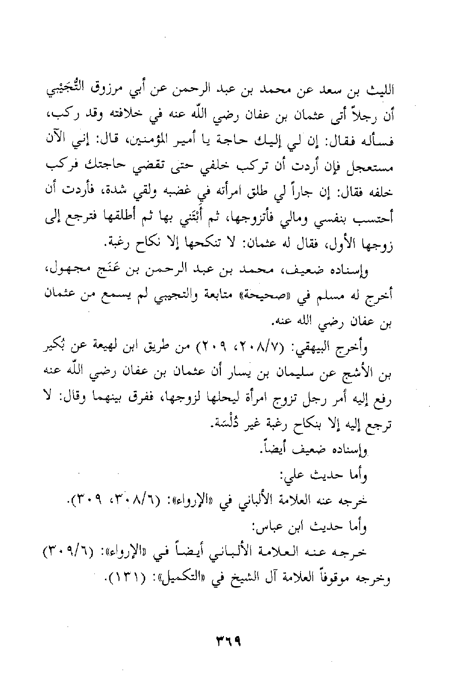 الليث بن سعد عن محمد بن عبد الرحمن عن أبي مرزوق التُّجَيْبي أن رجلاً أتى عثمان بن عفان رضي الله عنه في خلافته وقد ركب، فسأله فقال: إن لي إليك حاجة يا أمير المؤمنين، قال: إني الآن مستعجل فإن أردت أن تركب خلفي حتى تقضي حاجتك فركب خلفه فقال: إن جاراً لي طلق امرأته في غضبه ولقي شدة، فأردت أن أحتسب بنفسي ومالي فأتزوجها، ثم أَبْتَني بها ثم أطلقها فترجع إلى زوجها الأول، فقال له عثمان: لا تنكحها إلا نكاح رغبة.