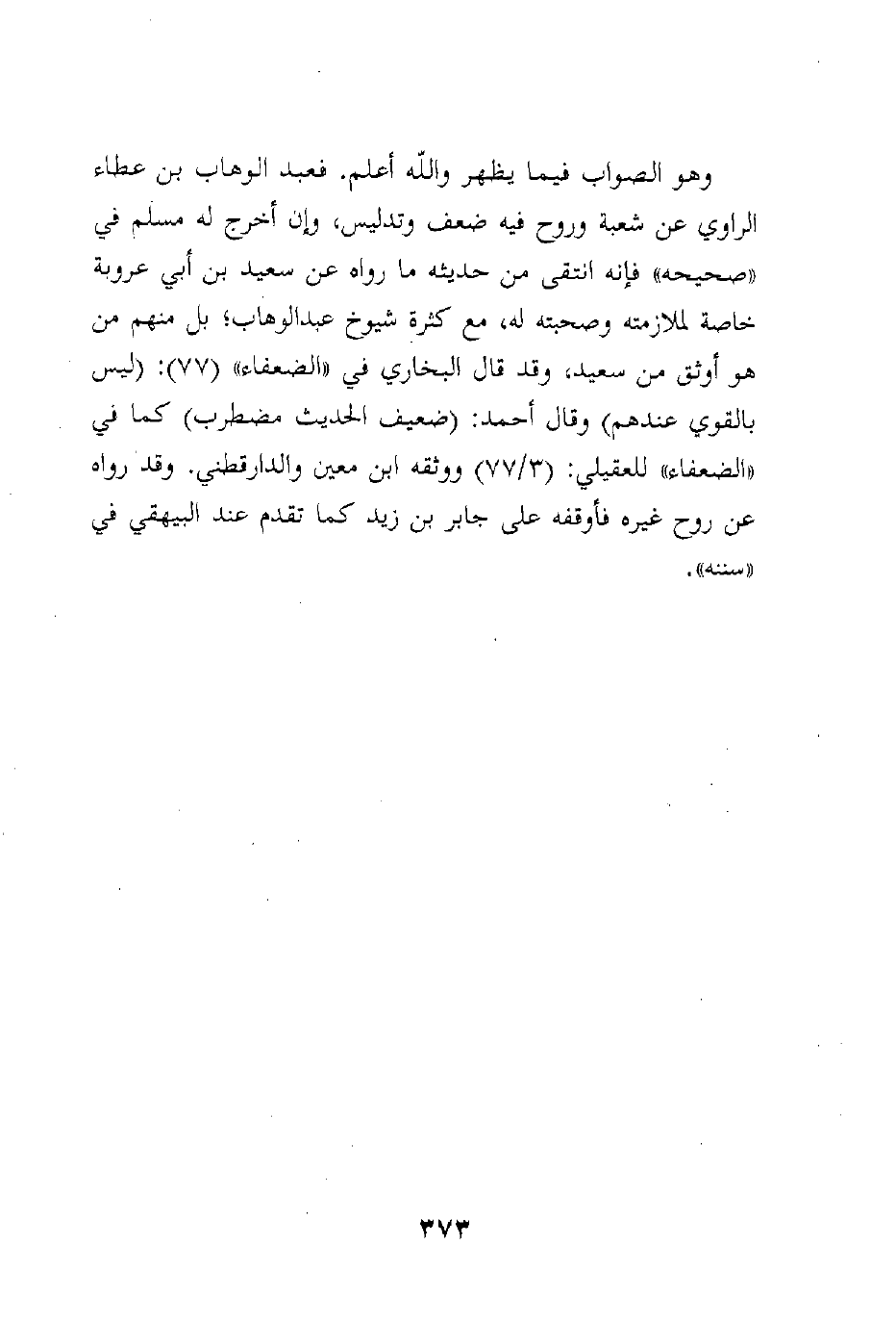 وهو الصواب فيما يظهر والله أعلم. فعبد الوهاب بن عطاء الراوي عن شعبة وروح فيه ضعف، وإن أخرج له مسلم في "صحيحه" فإنه انتقى من حديثه ما رواه عن سعيد بن أبي عروبة خاصة لملازمته وصحبته له، مع كثرة شيوخ عبد الوهاب؛ بل منهم من هو أوثق من سعيد، وقد قال البخاري في "الضعفاء" (77) : (ليس بالقوي عندهم) وقال أحمد: (ضعيف الحديث مضطرب) كما في "الضعفاء" للعقيلي: (3/77) ووثقه ابن معين والدارقطني.