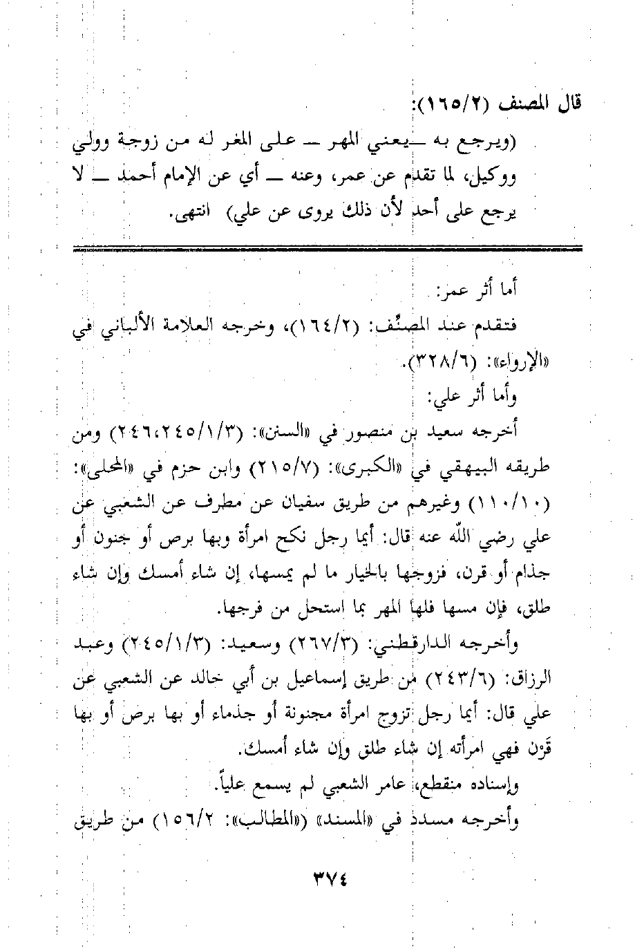 وأخرجه الدارقطني: (3/267) وسعيد: (3/1/245) وعبد الرزاق: (6/243) من طريق إسماعيل بن أبي خالد عن الشعبي عن علي قال: أيما رجل تزوج امرأة مجنونة أو جذماء أو بها برص أو بها قَرْن فهي امرأته إن شاء طلق وإن شاء أمسك.