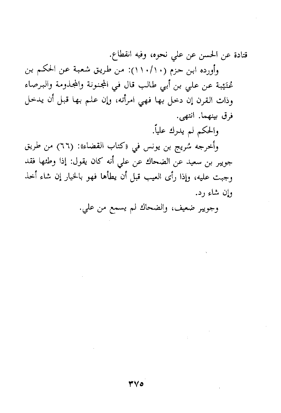 وأورده ابن حزم (10/110) : من طريق شعبة عن الحكم بن عُتَيْبة عن علي بن أبي طالب قال في المجنونة والمجذومة والبرصاء وذات القرن إن دخل بها فهي امرأته، وإن علم بها قبل أن يدخل فرق بينهما. انتهى.
