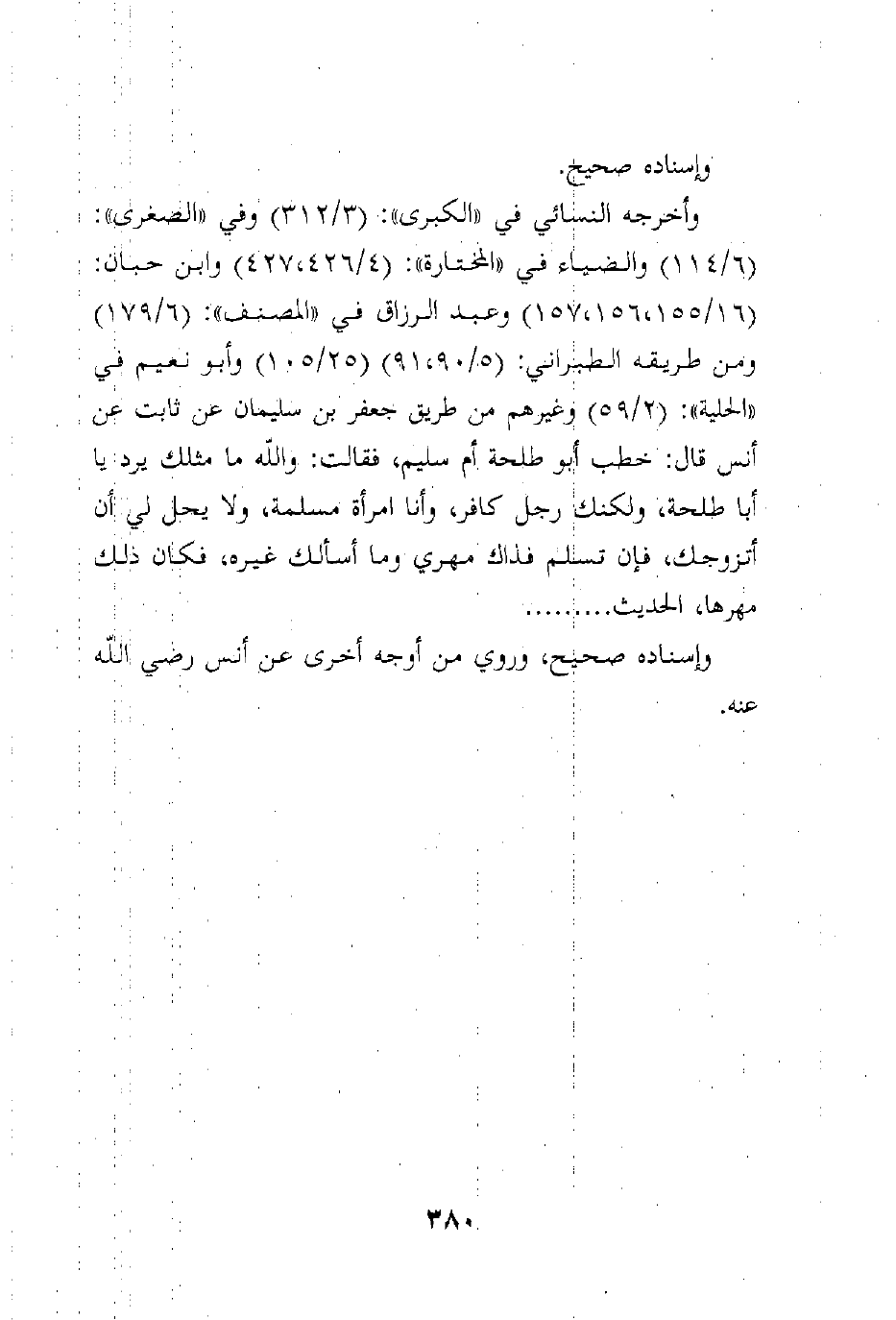وأخرجه النسائي في "الكبرى": (3/312) وفي "الصغرى": (6/114) والضياء في "المختارة": (4/426، 427) وابن حبان: (16/155، 156، 157) وعبد الرزاق في "المصنف": (6/179) ومن طريقه الطبراني: (5/90، 91) (25/105) وأبو نعيم في "الحلية": (2/59) وغيرهم من طريق جعفر بن سليمان عن ثابت عن أنس قال: خطب أبو طلحة أم سليم، فقالت: والله ما مثلك يرد يا أبا طلحة، ولكنك رجل كافر، وأنا امرأة مسلمة، ولا يحل لي أن أتزوجك، فإن تسلم فذاك مهري وما أسألك غيره، فكان ذلك مهرها، الحديث.........