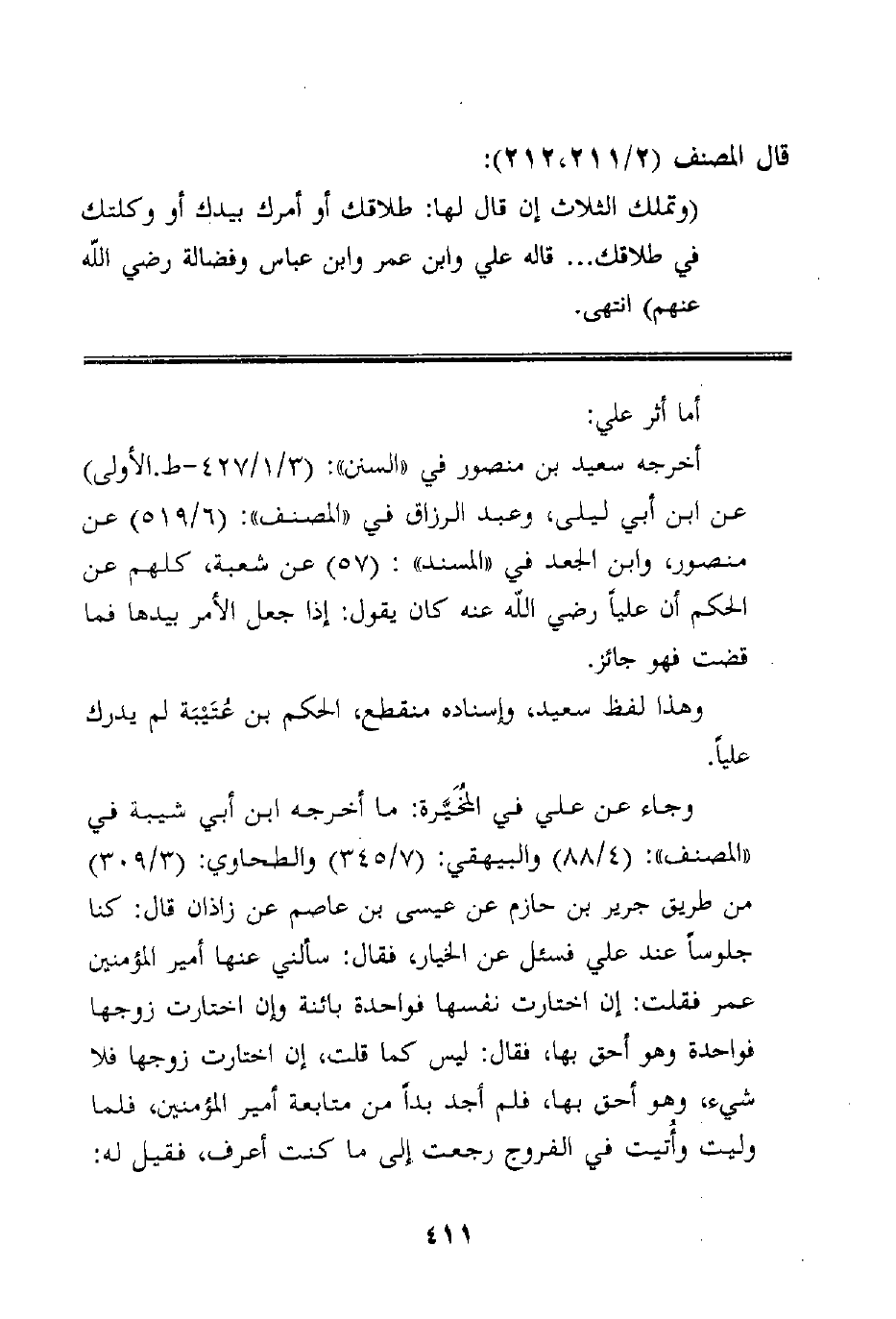 فأخرجه سعيد بن منصور في "السنن": (3/1/427 - ط. الأولى) عن ابن أبي ليلى، وعبد الرزاق في "المصنف": (6/519) عن منصور، وابن الجعد في "المسند": (57) عن شعبة، كلهم عن الحكم أن علياً رضي الله عنه كان يقول: إذا جعل الأمر بيدها فما قضت فهو جائز.