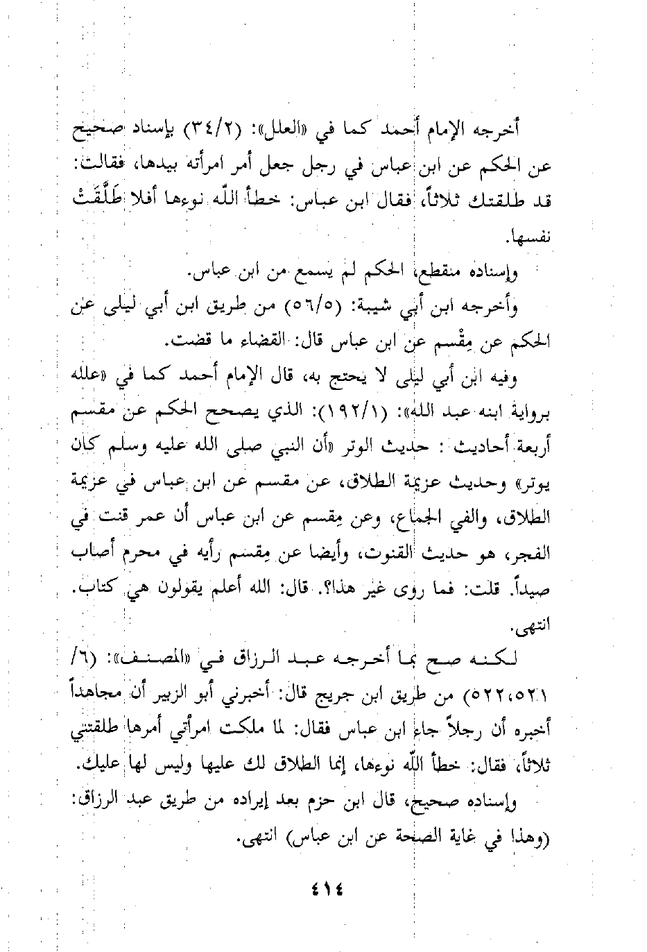 فأخرجه الإمام أحمد كما في "العلل": (2/34) بإسناد صحيح عن الحكم عن ابن عباس في رجل جعل أمر امرأته بيدها، فقالت: قد طلقتك ثلاثاً، فقال ابن عباس: خطأ الله نوءها أفلا طَلَّقَتْ نفسها.