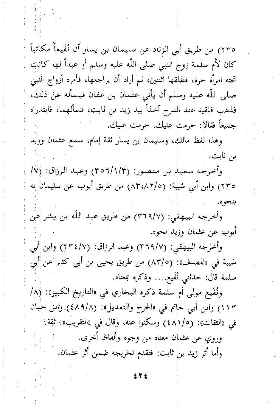 235) من طريق أبي الزناد عن سليمان بن يسار أن نُفَيعاً مكاتباً كان لأم سلمة زوج النبي صلى الله عليه وسلم أو عبداً لها كانت تحته امرأة حرة، فطلقها اثنتين، ثم أراد أن يراجعها، فأمره أزواج النبي صلى الله عليه وسلم أن يأتي عثمان بن عفان فيسأله عن ذلك، فذهب فلقيه عند الدرج آخذاً بيد زيد بن ثابت، فسألهما، فابتدراه جميعاً فقالا: حرمت عليك. حرمت عليك.