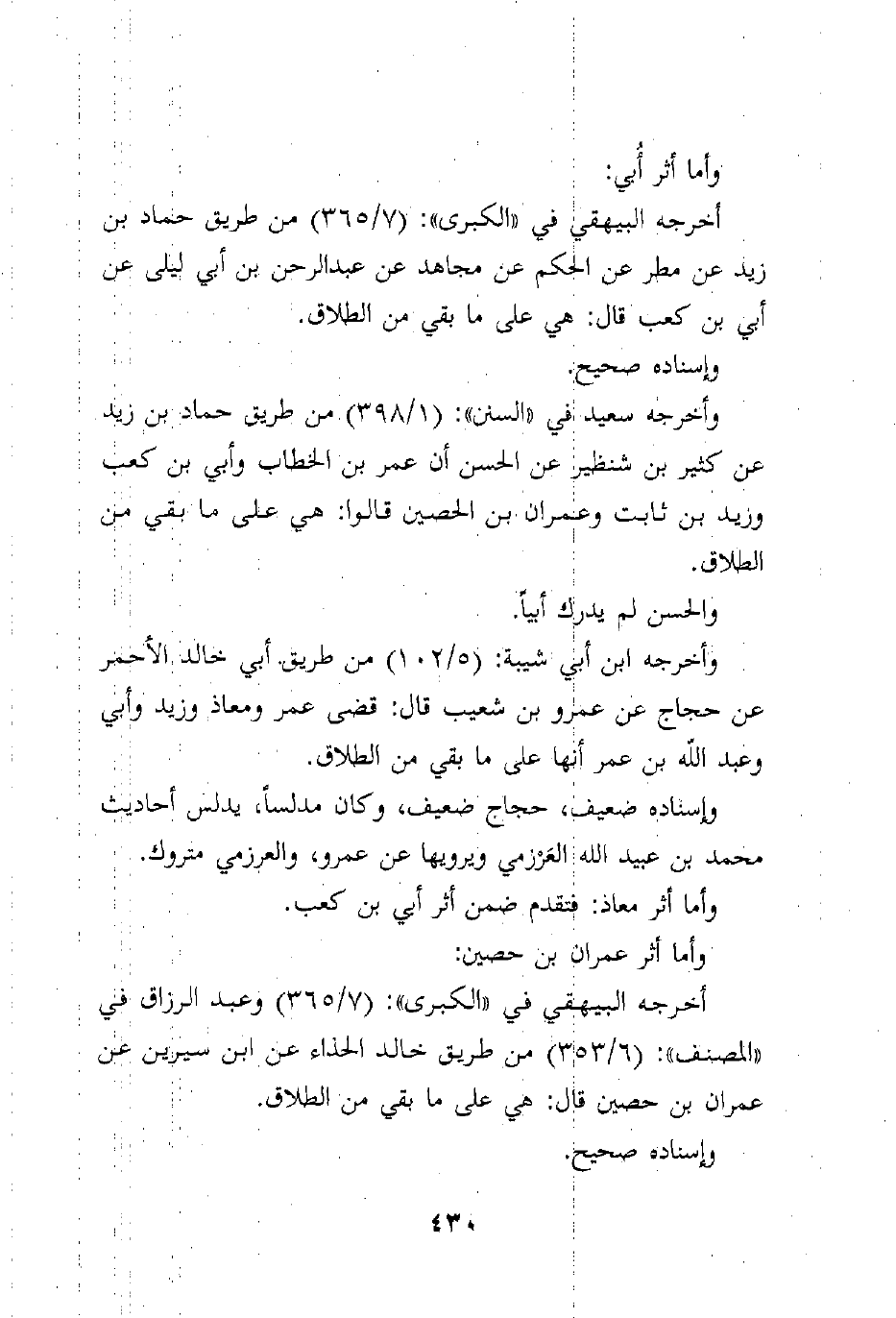 وأخرجه سعيد في "السنن": (1/398) من طريق حماد بن زيد عن كثير بن شنظير عن الحسن أن عمر بن الخطاب وأبي بن كعب وزيد بن ثابت وعمران بن الحصين قالوا: هي على ما بقي من الطلاق.