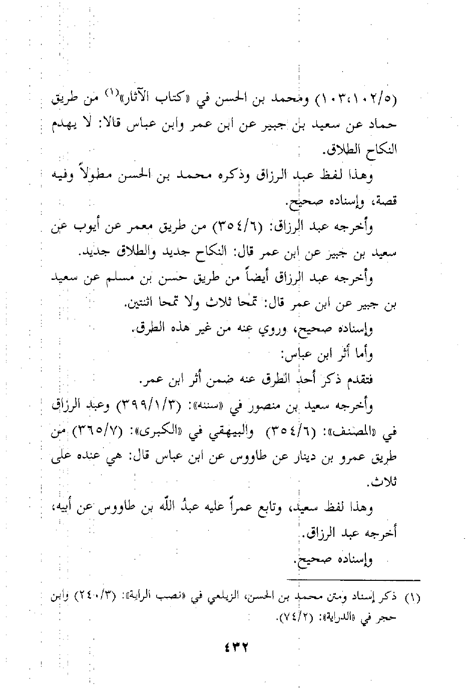 (5/102، 103) ومحمد بن الحسن في "كتاب الآثار" من طريق حماد عن سعيد بن جبير عن ابن عمر وابن عباس رضي الله عنهما قالا: لا يهدم النكاح الطلاق.