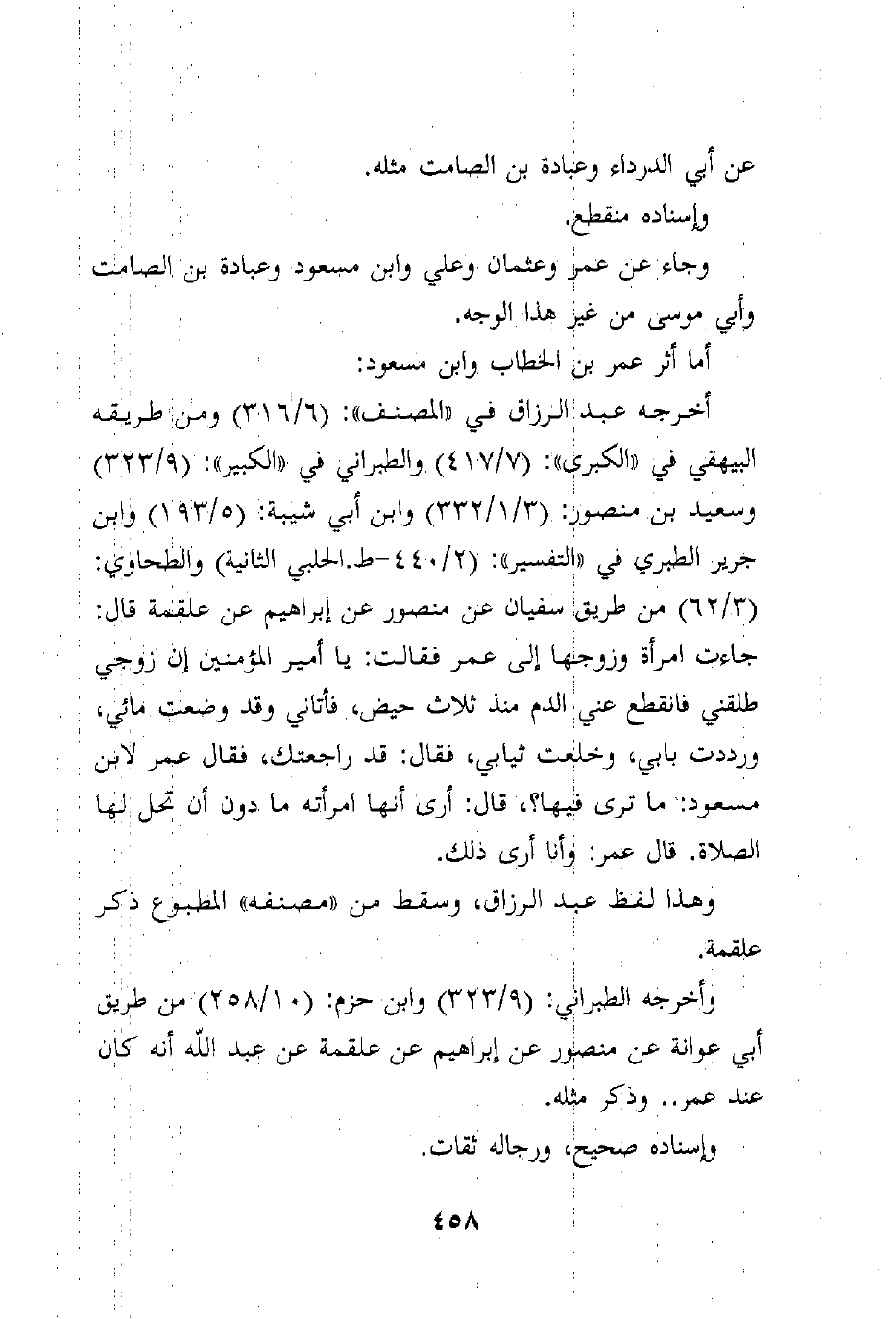 وأخرجه الطبراني: (9/323) وابن حزم: (10/258) من طريق أبي عوانة عن منصور عن إبراهيم عن علقمة عن عبد الله أنه كان عند عمر.. وذكر مثله.