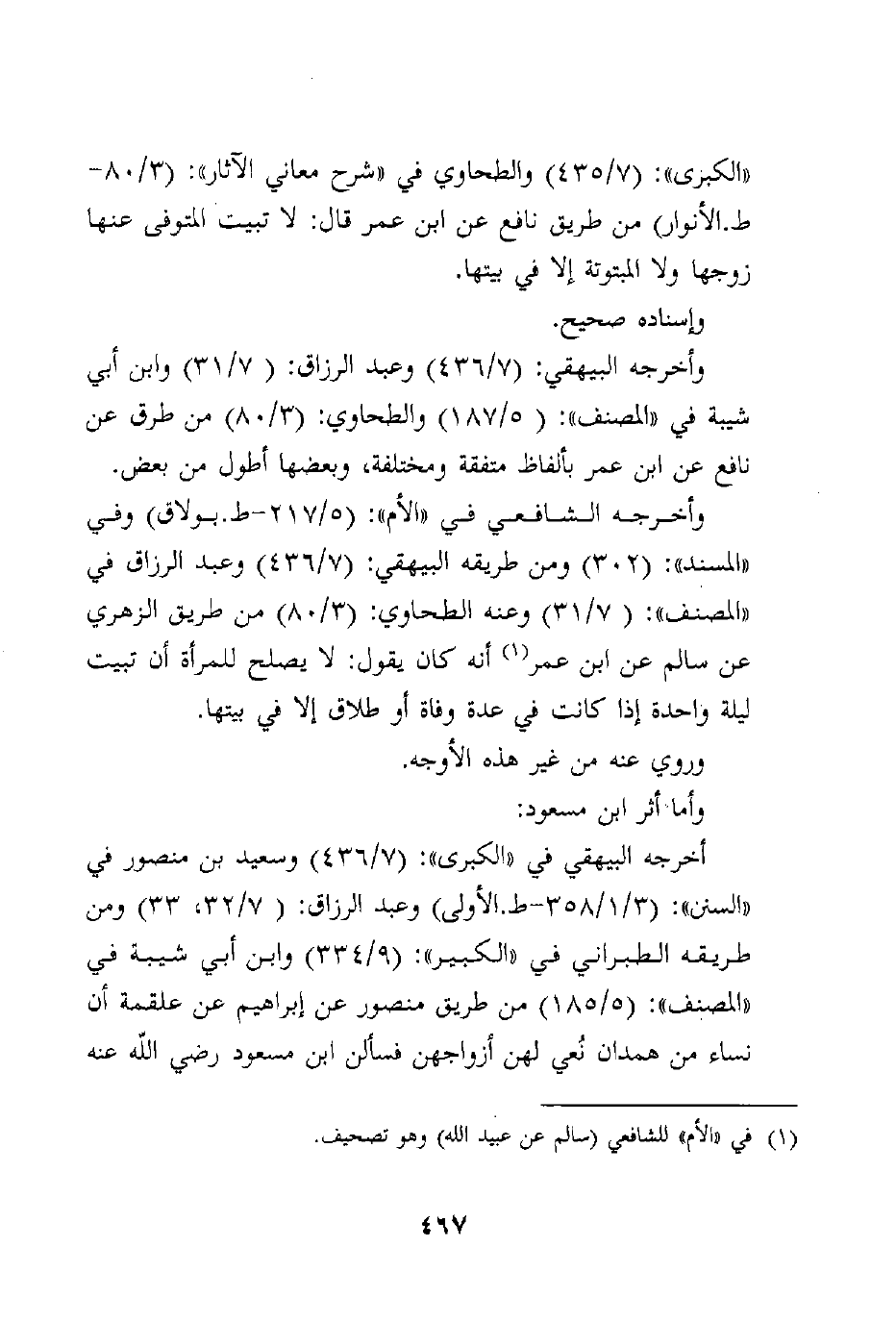 وأخرجه الشافعي في "الأم": (5/217 - ط. بولاق) وفي "المسند": (302) ومن طريقه البيهقي: (7/436) وعبد الرزاق في "المصنف": (7/31) وعنه الطحاوي: (3/80) من طريق الزهري عن سالم عن ابن عمر أنه كان يقول: لا يصلح للمرأة أن تبيت ليلة واحدة إذا كانت في عدة وفاة أو طلاق إلا في بيتها.